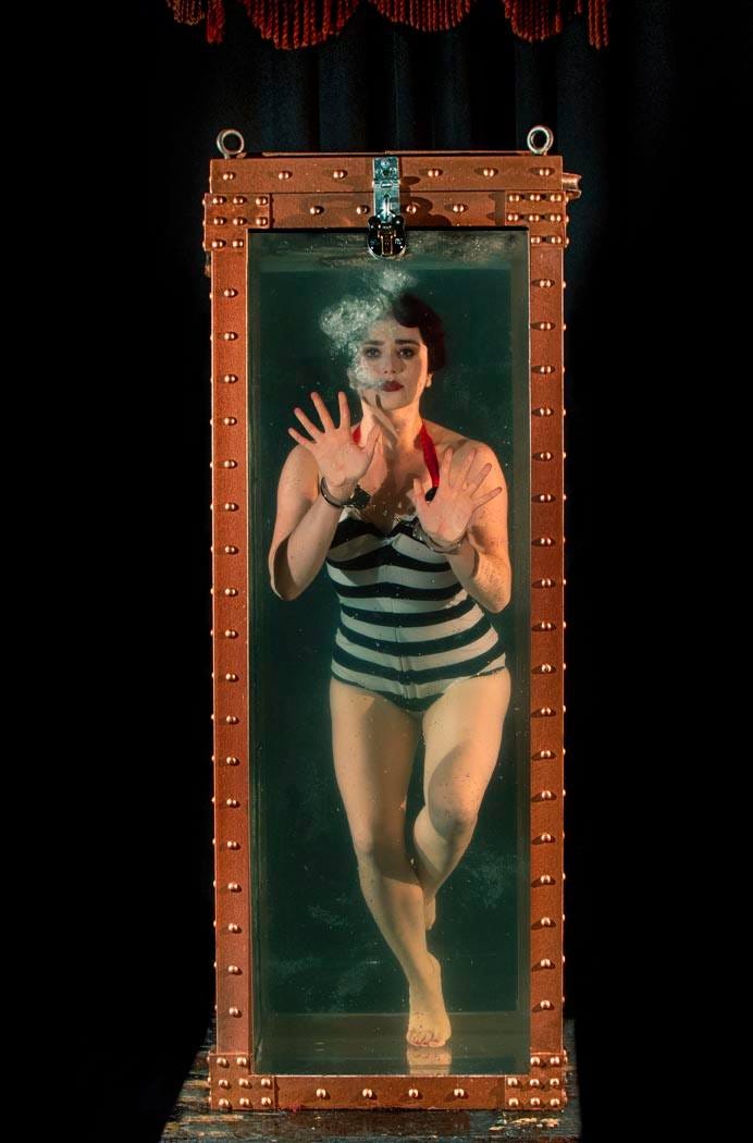 Private eye Minky Woodcock (played by the magnetic, charismatic Pearls Daily), having gone undercover as Harry Houdini’s newest assistant, finds herself submerged in several feet of water. She floats in front of us, struggling to free herself from a pair of handcuffs. Minky grimaces behind glass as the entire audience holds its collective breath; unfortunately, the Great Houdini (a smug Vincent Cinque) had been mysteriously injured at a previous performance, and this was the only way the show could go on.