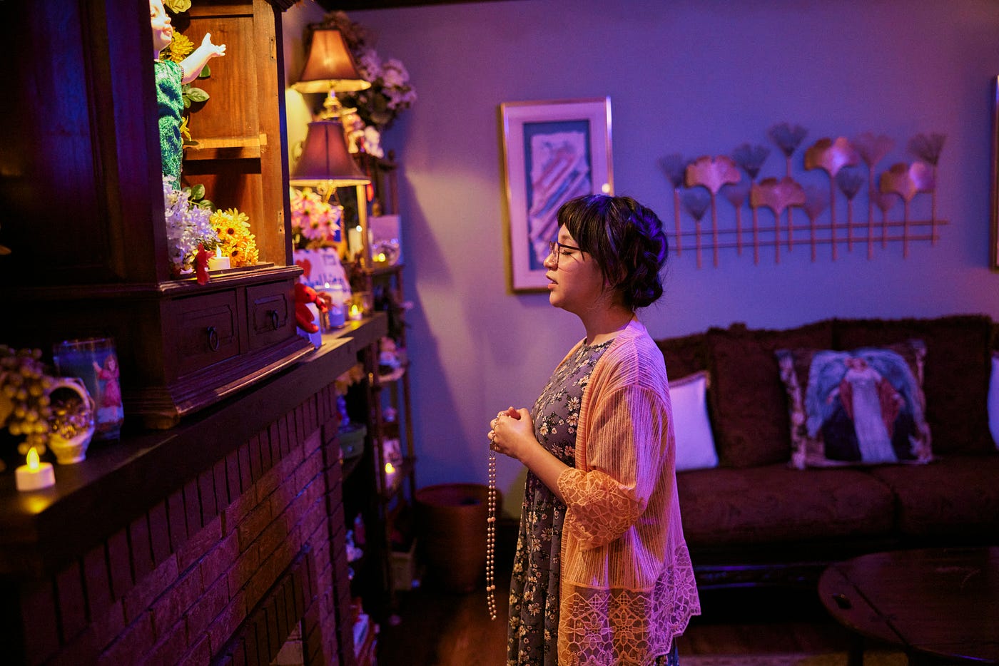 The first stunning element is Port of Entry’s production design. While the courtyard is mostly a suggested space, a majority of hallways and apartments are fully functional and furnished. These spaces are instantly believable, but it wasn’t the quality or quantity of details at work that fooled me. It was the choice of which details were featured that pulled me in–the unconventionally shaped pantries, the sound of planes overhead approaching O’Hare, the fireplace sandwiched between built-in shelving units of equal height. Only when moving between floors, as the stairwell is a neutral, stylized space, did I remember this “building” was a massive set.