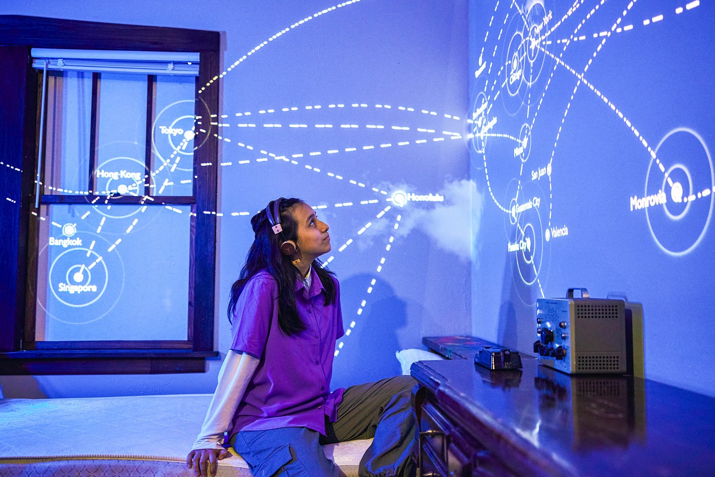Yet, the building’s believability was only part of what made the production design fantastic. It was when the realism faded away, slowly replaced by intense elements of theatrically that left me breathless. Throughout Port of Entry, as tenants convey stories of mundane or intense struggles, the natural lighting and cityscape sounds fade away, replaced with anything from projection mapping to single spotlights illuminating the space underscored by sweeping orchestrations or a cacophony of discordant sounds. These dramatically emphasized moments drew me into each tenant’s story, their joy and sorrow intensely personified.