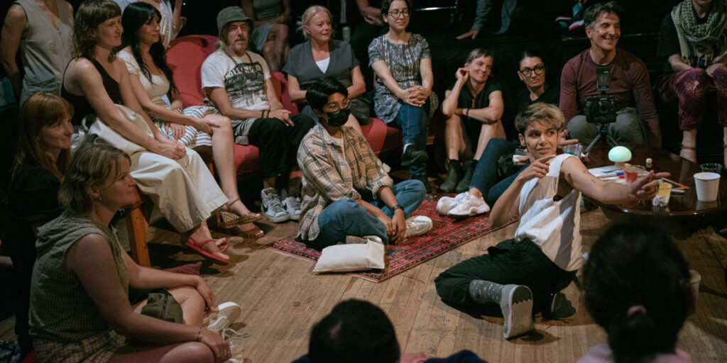 Elephant places us inside a vibrant, slightly surreal dinner party made up of a cozy living room, and long banquet table. It opens with a poetic meditation on the so-called “elephant” in the room: in this case cancer, and how we choose to engage (or not) with uncomfortable truths, before launching into a blend of communal storytelling, participatory games, dance, and musical covers. The tone often shifts abruptly from whimsical to raw, then back as scenes of playful conversation are followed by aching dances and confrontations about mortality.
