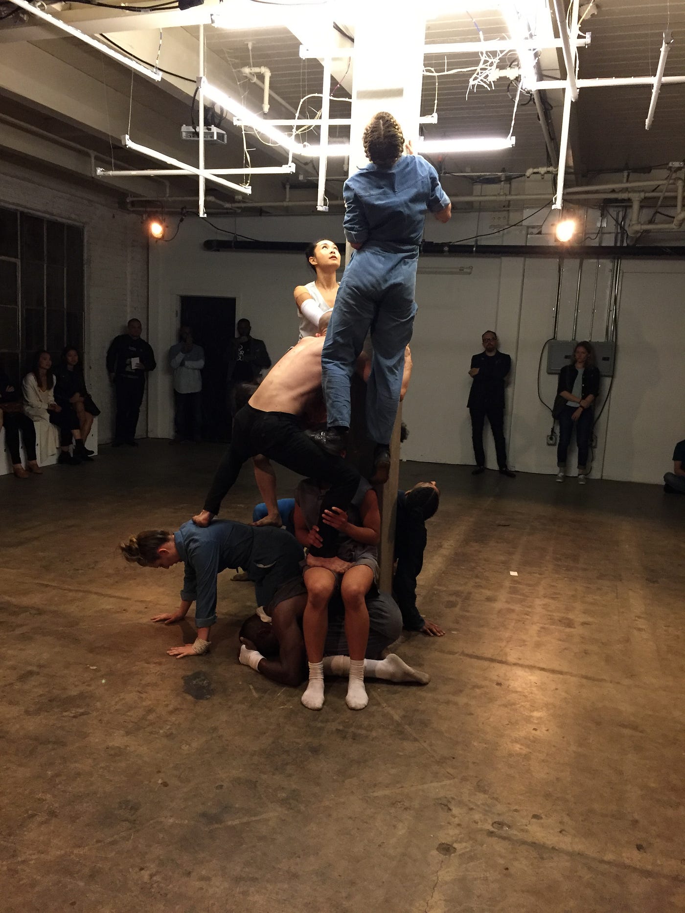 The dancer performing this little ritual was one of the three assigned to the role of “factory worker” in this piece. Or at least that’s how I came to define them. Creator Sophia Stoller has devised with her exceptionally talented collaborators a world that translates the infamous psychological role-playing of the Stanford Prison and Milgram experiments into a piece of contemporary dance theatre with a moving political message.