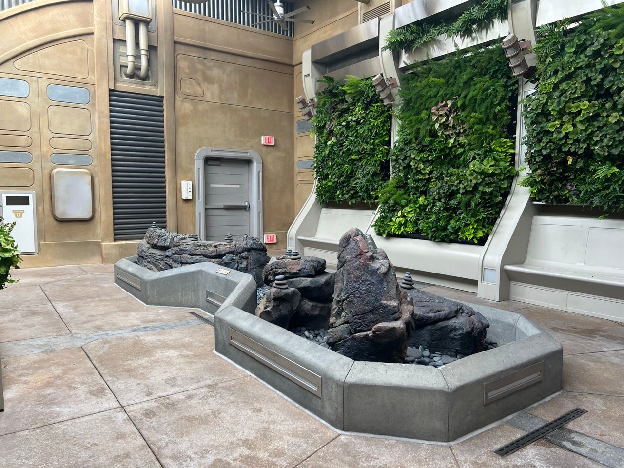 All that comes to a stop when we make our way to the “climate simulator” on board the ship. In reality this is the outdoor patio for the otherwise sealed up “ship” which in the fiction of the show is there to acclimate us to Batuu’s strangely Floridian atmosphere. (Extra strange for those of us who were born in the real Batuu: Southern California.)