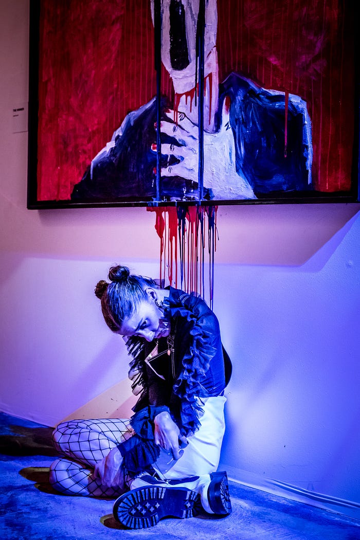 What begins as an art show slowly transforms over the course of the evening, until it all goes to hell. And once it goes to hell, the show ratchets up to Maximum Creep. As the end begins, the frenzy is slow to start, but you can feel it in the air. And then the energy becomes charged, kinetic, frenetic. As The Company falls and the art rises up in defiance of their chains, chaos and change take over. The change contrasts with the rest of the show (and mirrors the beginning of Haus of Creep) and helps put a perfectly Creep-y button on the show.