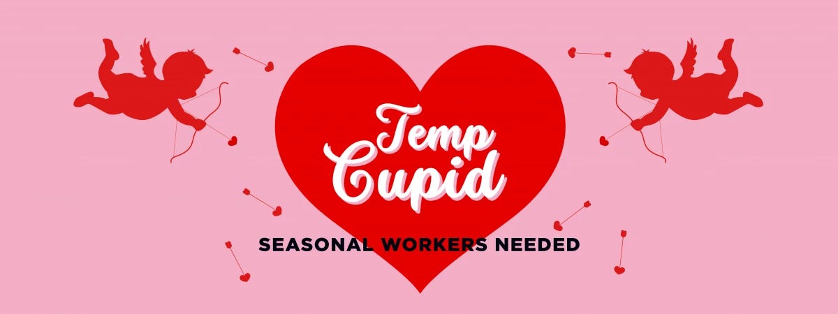 Temp Cupid is about what happens when the God of Love turns to seasonal workers in order to meet the demand around Valentine’s Day. The temp workers? You and your fellow ticket holders. The job? Help lonely hearts find their match. Your tools?
