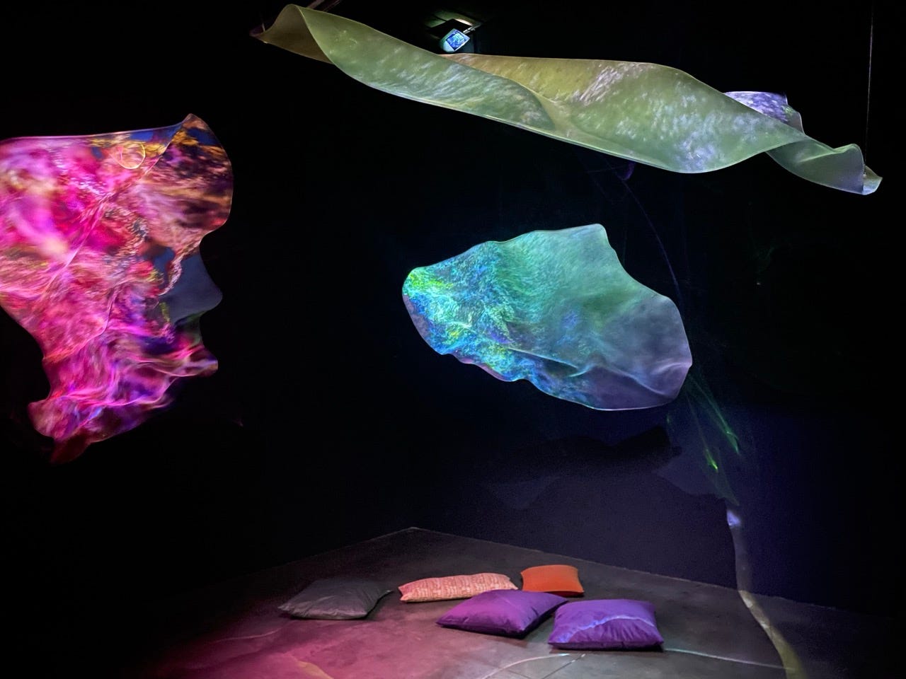 Perhaps most notably, a dark back room features yet another moment for reclined reflection with a series of pillows scattered on the floor beneath three large-scale, organic leaf sculptures colorfully projected upon.