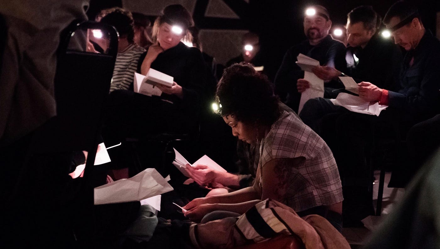 The Eagle and the Tortoise is a live documentary about the Kurdish people and the story of a Turkish woman who became an icon of leftist resistance and a political pawn. When you enter the theater, you don a headlamp and open a handmade book. A live musician starts to play and the performance moves between you reading content alone and then watching a series of video projections while listening to a live narration of Kurdish history, buried villages, and reclassified rivers. Your only interactions are reading, pointing your headlamp in a direction, and two very small personal steps you take from your seat.