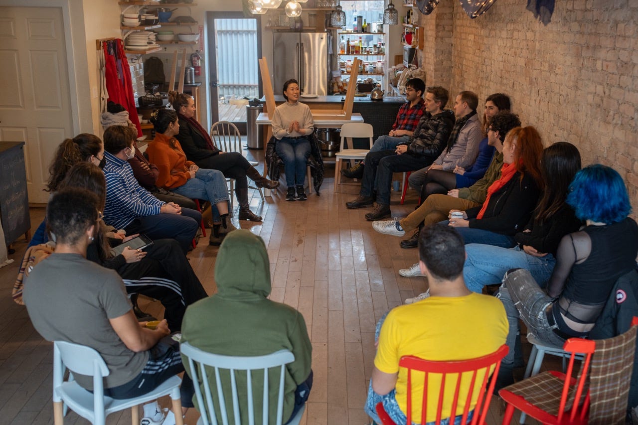 It all seems friendly and familiar enough at first. In a cozy Brooklyn storefront, a support group is holding their weekly meeting. Tea and snacks are laid out. The audience sits amongst the group members — until each actor speaks, it’s hard to distinguish spectator from performer. The group leader, Gwen (Vanessa Kai) invites Regina (Daphne Overbeck) to finish the story she began telling last week.