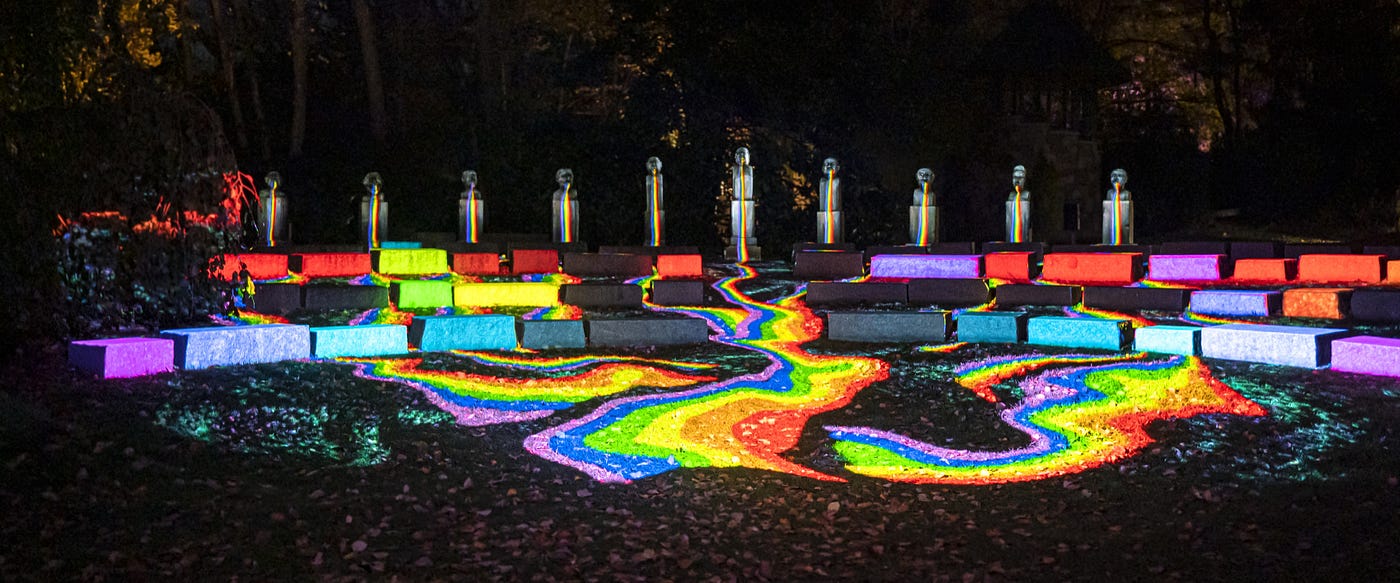 Using 3D projection mapping and LED devices, Nightforms: Infinite Wave, by the Klip Collective, fills the already spectacular Grounds for Sculpture’s space with new energy. Sculptures that strike daytime viewers as structural exercises in substance, like Masayuki Koorida’s Memory, a granite mound of bulging surfaces, roll and blink and pulse with grotesque fleshy life as mind.fract. Substance shifts and transforms, occasionally glitching out, bursting into an explosion of static.