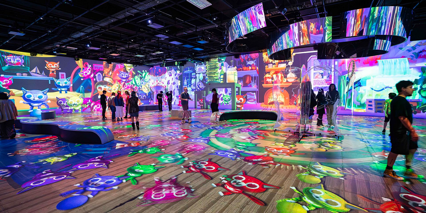 Whereas the first room strived to bring us a sense of calm, this second space held snippets of zaniness. In contrast, our final destination contained a no-holds-barred visual smorgasbord. A fashion runway, Rainbow Road-esque racetrack, and a parade were just a few of the scenes we cycled through. This third room contained interactive elements on the floor — a feature that often feels like a gimmick in similar spaces, but was a welcome addition here, especially during a Where Is Waldo inspired segment involving dancing cats and dogs.