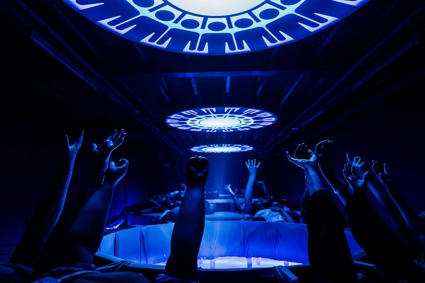 We made our way through a dark corridor with stars twinkling above us and approached a white, sterile Westworld-style waiting room. One by one, we were handed devices attached to lanyards and headphones. Our group was assigned a color and once the room lit up in our color, we took our cue to enter.