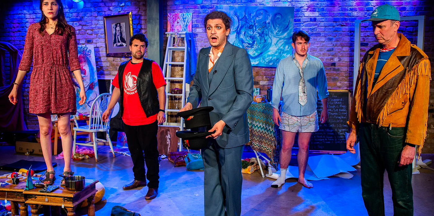 As I walk into the room, a hot pink gorilla hands me two pieces of cardstock, one red and one green. We’re told that we’re actually in outer space and part of the studio audience for a TV show. At certain times, we can vote for an outcome using our colored cards, and at any point in the show, we can pause the action to request a monologue, a musical theatre number, an interpretive dance, or an on-the-spot “auction” of any item on stage. All the while, a drama about love, murder, xenophobia, and feminism unfolds.