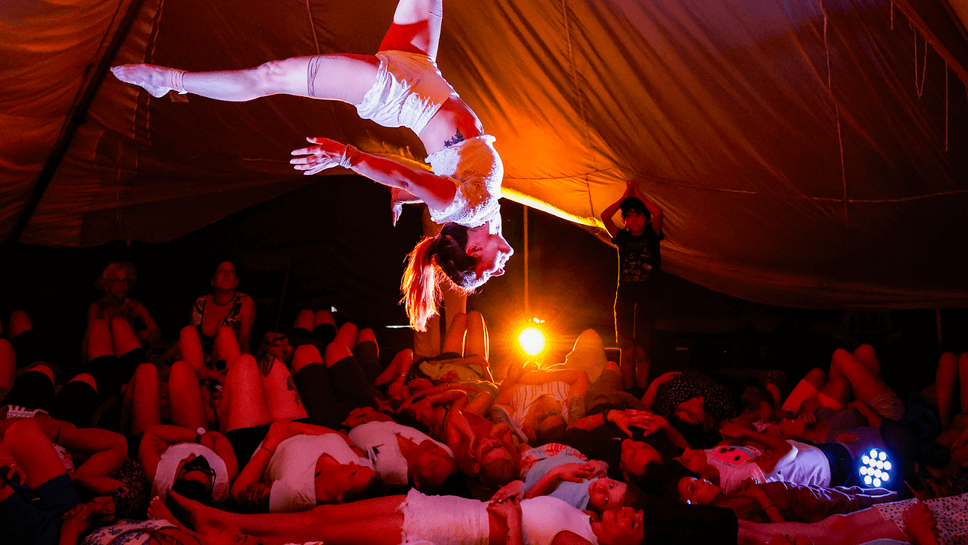 We stand gathered around a sheet. When given the signal, our hands grasp its edges and we lift it above our heads, walk underneath, and then lower it beneath our feet. We’ve built a big top, but this one is more intimate than most — the quarters are cramped such that the delineation between stage and audience is blurred. Hoops spin unnervingly close by, acrobats swing from a trapeze directly above my head, and props are handed to us for safekeeping. At one point, I hold onto a piece of rope alongside four other audience members while the performers, kept aloft by the rope and their trust in a handful of strangers, twirl in the air.
