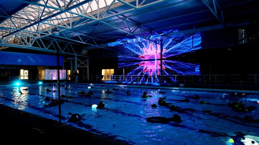 After a twenty-minute Scotrail ride away from the bustle of the festival city, I find myself floating in the pool at Deans Community High School. Colored lights, a sprinkler, and miscellaneous inflatables scatter across the surface of the water. We’ve all been given the identity of a specific international body of water and told that this pool is the gathering place where we’re all to connect. Twinkling projections fill the space and soothing music fills the air.