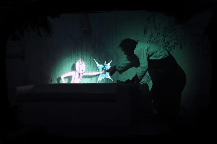 Our live experience mixes environmental design, projection mapping, with augmented reality. These elements when put together, both immerse the audience, but further the story and the world of the universe. The technology is used very specifically to serve that purpose, and is not used for the sake of showing off technology. Part of what we hope to do with this universe is take it out of the live experience and enable people to access it through their own mobile device. At this point, AR is not immersive in our minds. It is interactive; the audience interacts with it and the AR, in turn, interacts with the foreign environment it has been introduced to. When we describe our work, we use the terms immersive and/or interactive.