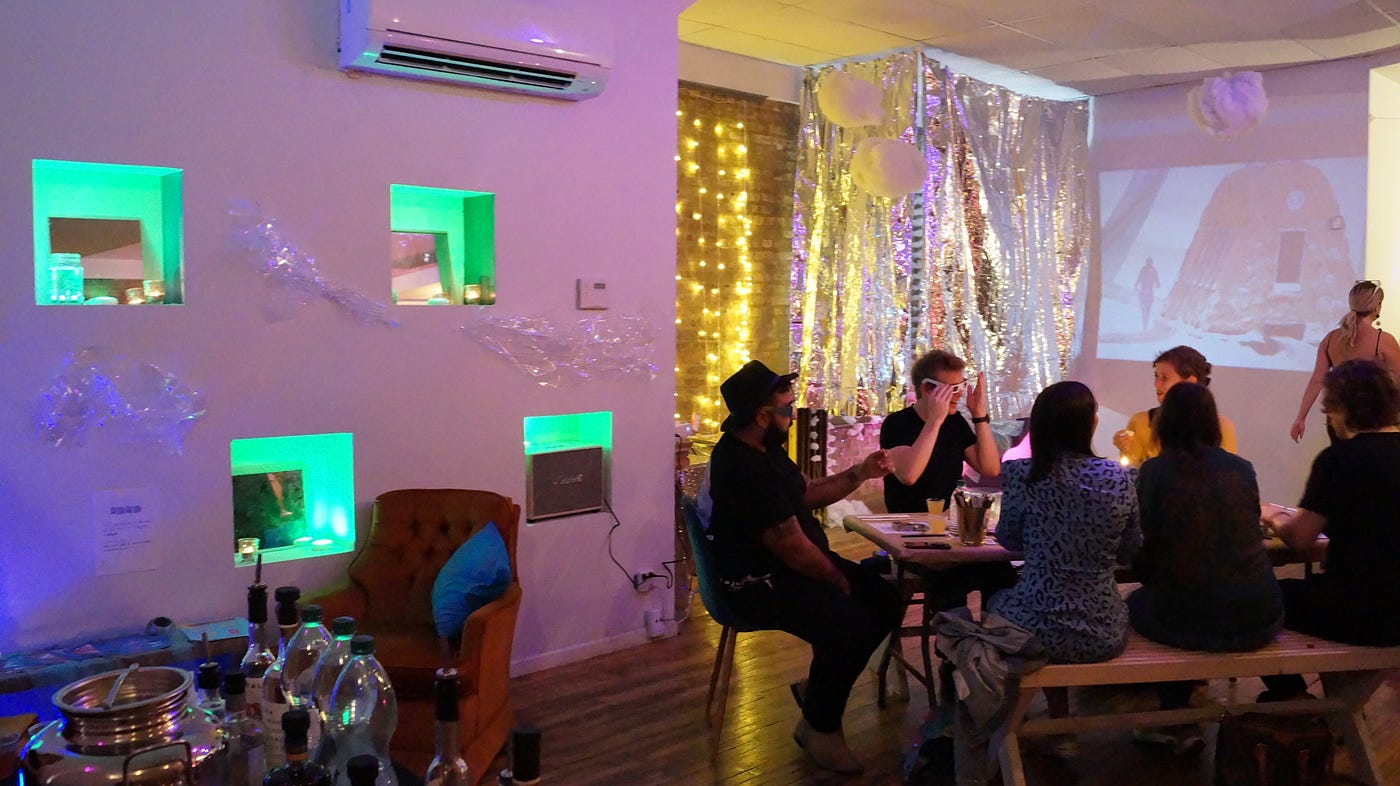 Yet this is only a best guess on what Open Spaces was trying to achieve. Without any dramatic structure or question proposed to what the audience agency should be, I can only offer a shot in the dark as to what Open Spaces wants me to walk away thinking and feeling. I welcome the chance to chew on a thought-provoking, open-ended question yet simply wish I knew the question being asked. During dinner only I kept bringing up questions of what the alien’s goal was and how best we should interact with them, seemingly not forefront on anyone else’s mind. When the activities began, my table was the only one participating with only a couple of other guests between the other tables leaving to experience something else in the space. I wondered if anyone was making a distinction between this being an immersive experience or simply attending a friend’s dinner party with a theme layered on for flavor.