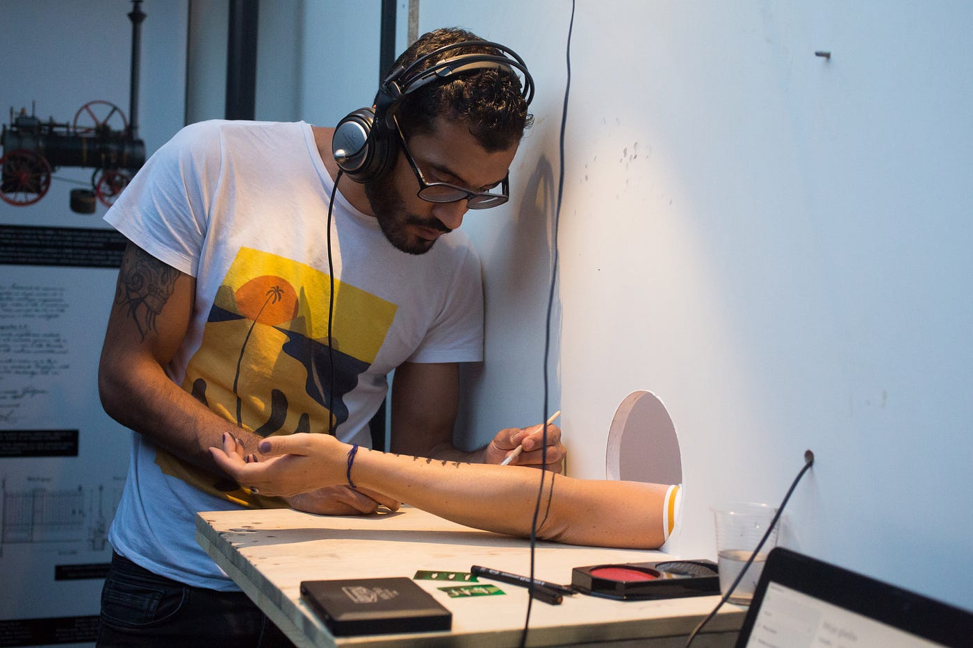 On the other side of the wall is a refugee, through the headphones you hear his story in prose and song. As it unfolds, he draws a representation of the tale on your arm.
