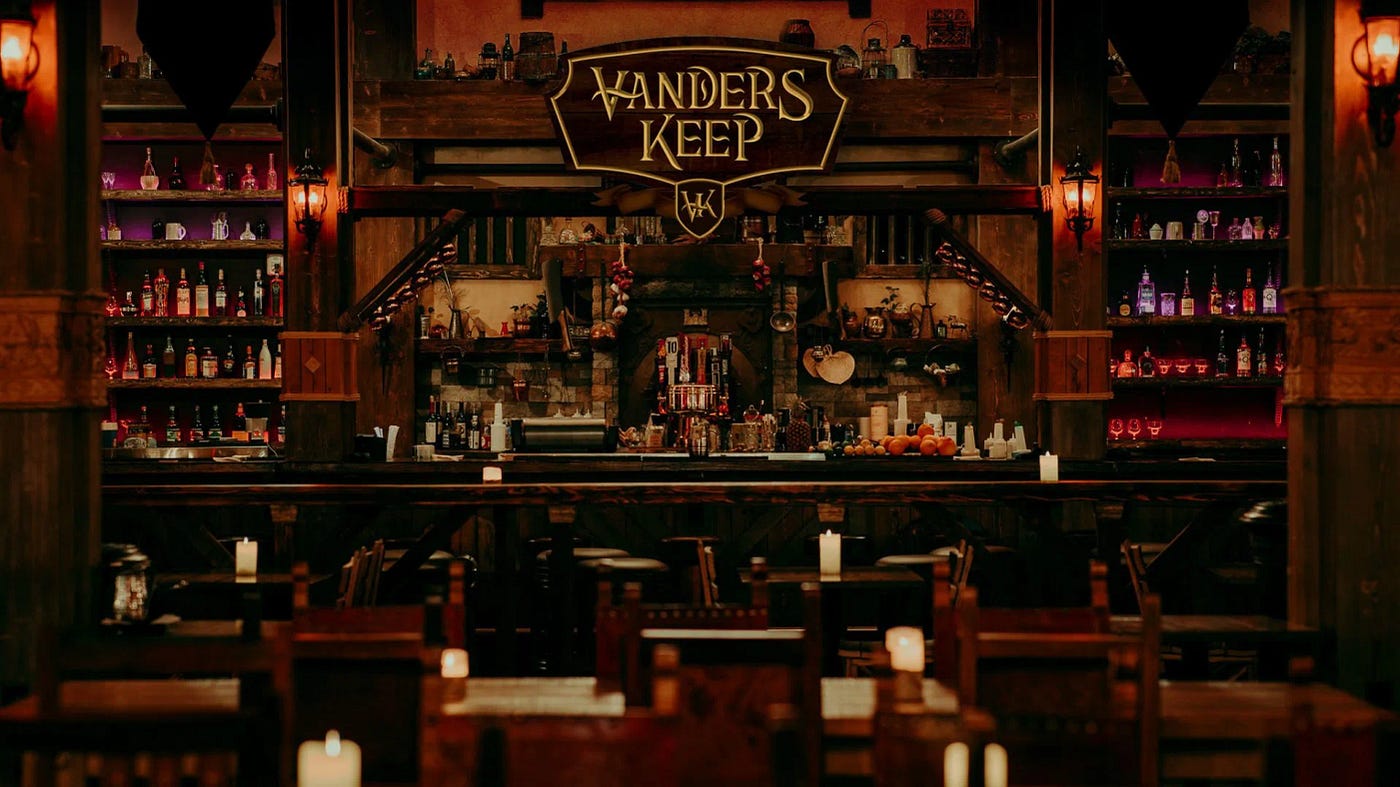 My visit to Evermore was less like entering an epic fantasy world and more like spending an afternoon in a fairyland play-park with a few lovely characters and little-to-no coherent narrative. Quests were barely disguised scavenger hunts, and — while I appreciated the delineation between children’s and adult quests — very little of the experience felt aimed at adults. The exception, of course, was Vanders Keep. This hidden jewel is well worth the (admittedly reasonable) price of admission. My group ended our evening cozied up to the restaurant’s beautifully designed bar, chatting with the Keep’s resident mixologist, Aaron. He and his fellow barkeepers are full of stories and songs, if you catch them when things aren’t too busy.