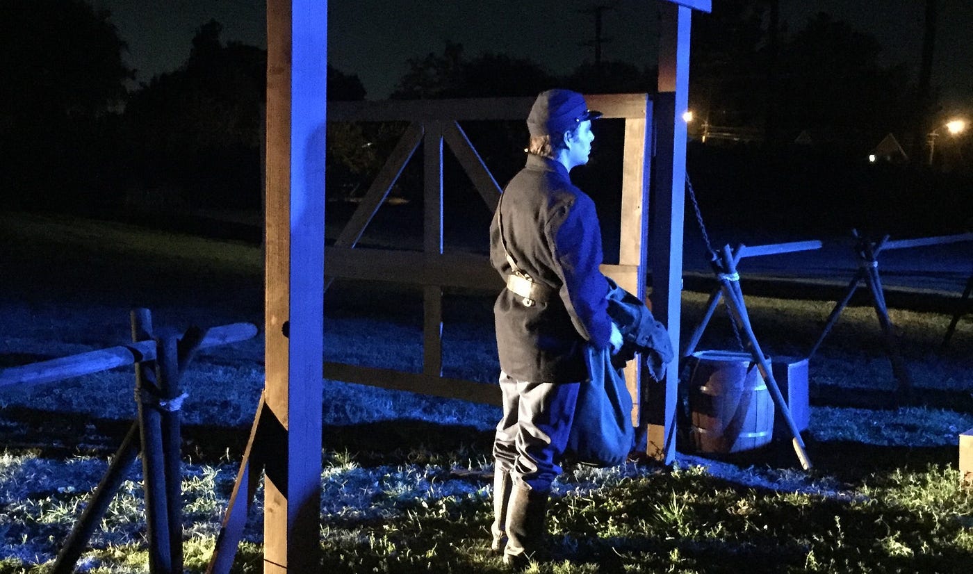 Finally, we were invited to experience Margaret Oliphant’s “The Open Door,” adapted by Kristen Brandt and directed by Paul Millet. This is a melancholy tale of a sick child with a mother and father willing to do anything to save him. We followed Henry Mortimer (Michael Perl), a British general home from the war, and his wife, Charlotte Mortimer (Jena Hunt), as they tend to their haunted child, battling with a spirit who refuses to move on. A classic gothic tale filled with morose and tragedy conveys a feeling of foreboding through its use of lighting and outdoor staging in a courtyard.
