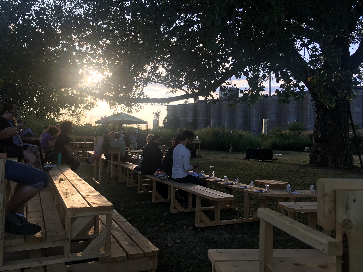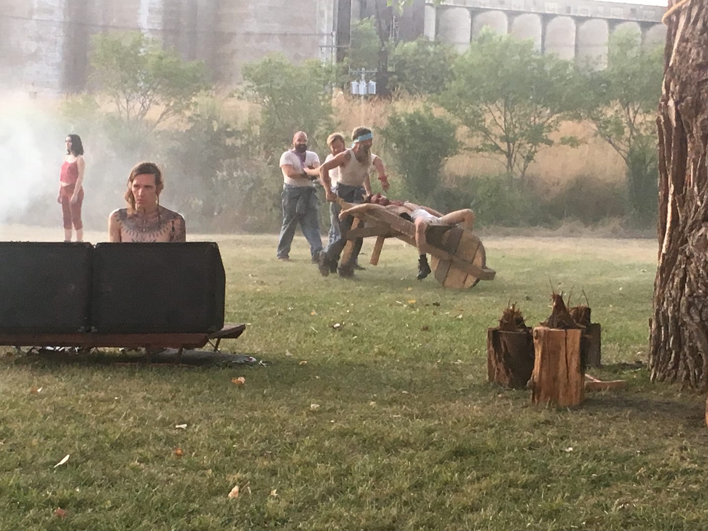 The piece begins with the audience being led through a green space in front of the eponymous Silos encountering many of the characters featured in the piece. There is a strong man, Burden, confined to a drainage ditch, a sexualized imp climbing a structure, a team of workers tending a cow, and a pregnant woman (belly fully exposed) performing a ritual cleansing with sage. Eventually, the sojourn is concluded when the audience comes across a clearing, with a seating structure built around a tree and a field. Once seated, the ritual commences, with the foolish “King of the Feast” demanding that ceremonial surrogates (including “Birth,” “Pain,” and the aforementioned Burden) be brought for his pleasure while we eat a custom menu of local delicacies. As the surrogates enter the space, they stay present after their part in the ritual, building an increasingly complex tableaux of humanity amidst the nature in front of the post industrial wasteland. And as quickly as it began, all of the performers thank us and walk down a path away as the piece concludes.