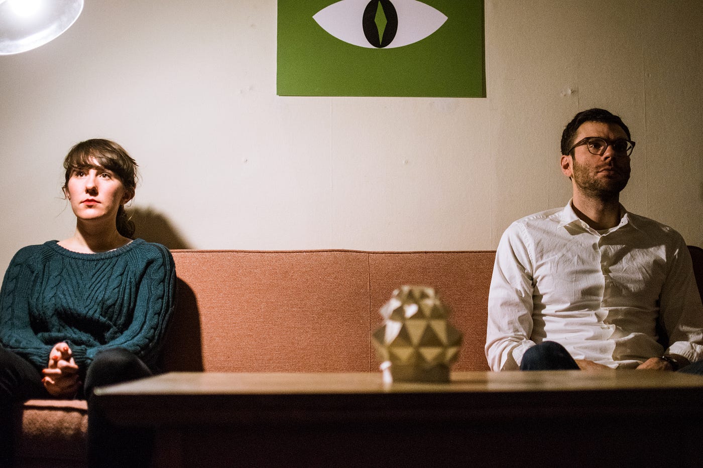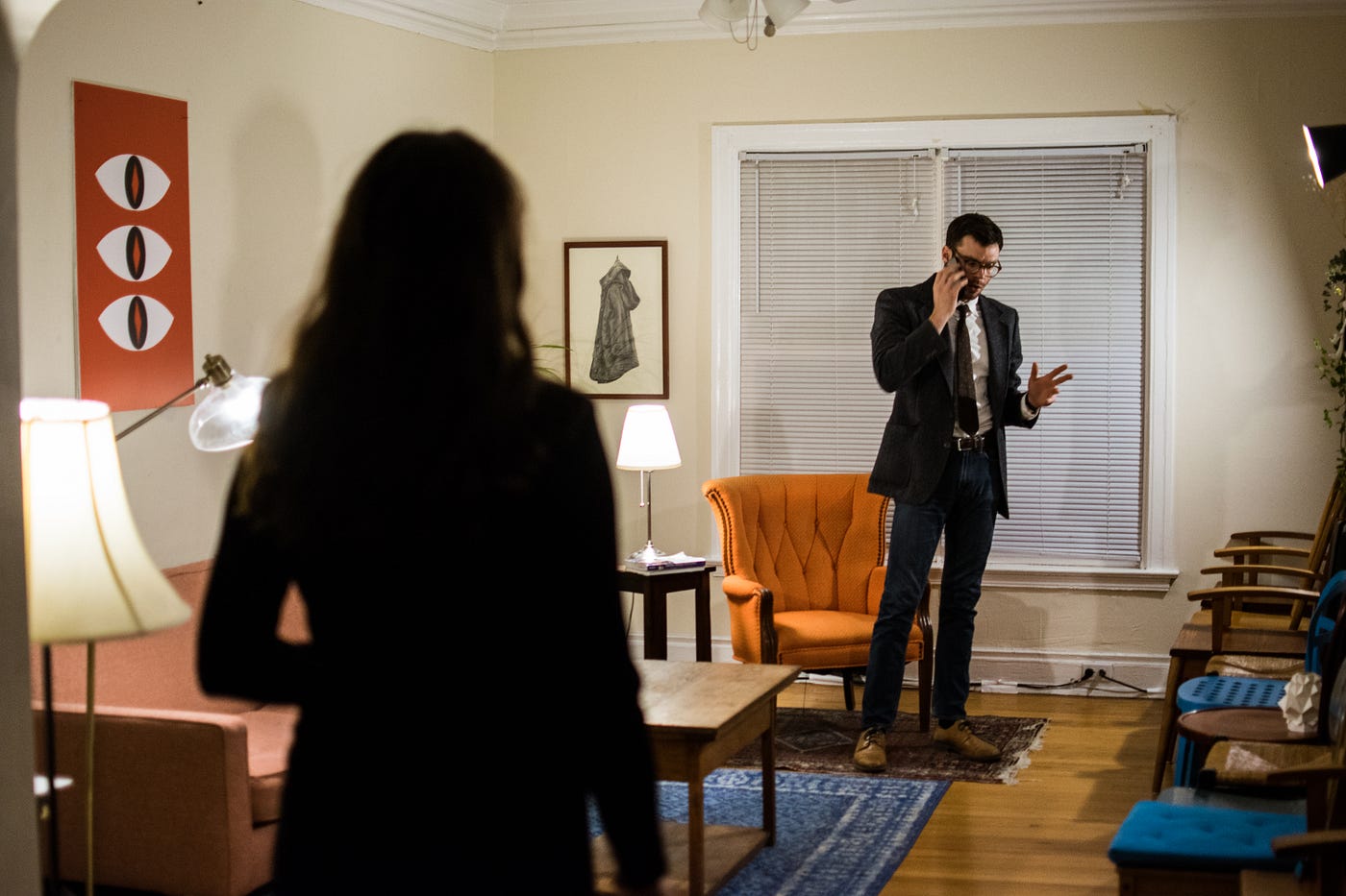 On arriving, I enter a traditional Chicago walk-up apartment building. On the 2nd floor, I’m welcomed to wander around an apartment, which someone currently lives in, serving as the venue for tonight’s performance. Unsure of where to go or what to do, I stand in the hall that connects all the rooms, not wanting to disrupt anyone as it seems more like a house party among friends. I spent my time trying to figure out which party guests — if any — are part of “the show.” Eventually the audience is ushered into the living room where there’s a line of chairs placed against one wall. The audience is allowed only to sit in these chairs. The show then begins: there’s the traditional lights down, lights up opening. I see the actors are now in place to begin the play, standing mere feet from the audience.