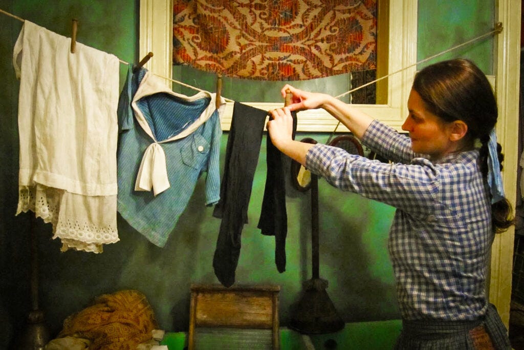 Thanks to the setup, Victoria’s appearance left me feeling star-struck and that atmosphere of amazement seemed to bubble through our eager tour group. The educators quickly jumped in to ask Victoria questions to set the tone and break the ice for our suddenly shy audience. They asked Victoria what she was doing. Victoria was cleaning the home before her parents came home. She apologized for her English, explaining to us how when she went to school, they put her all the way back into a younger grade with babies. She told us about the clothing of the time and how her mother insisted on wearing items that were not considered fashionable.