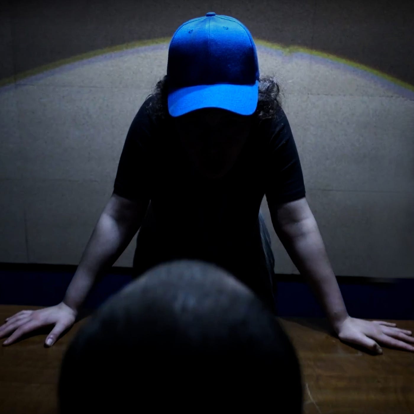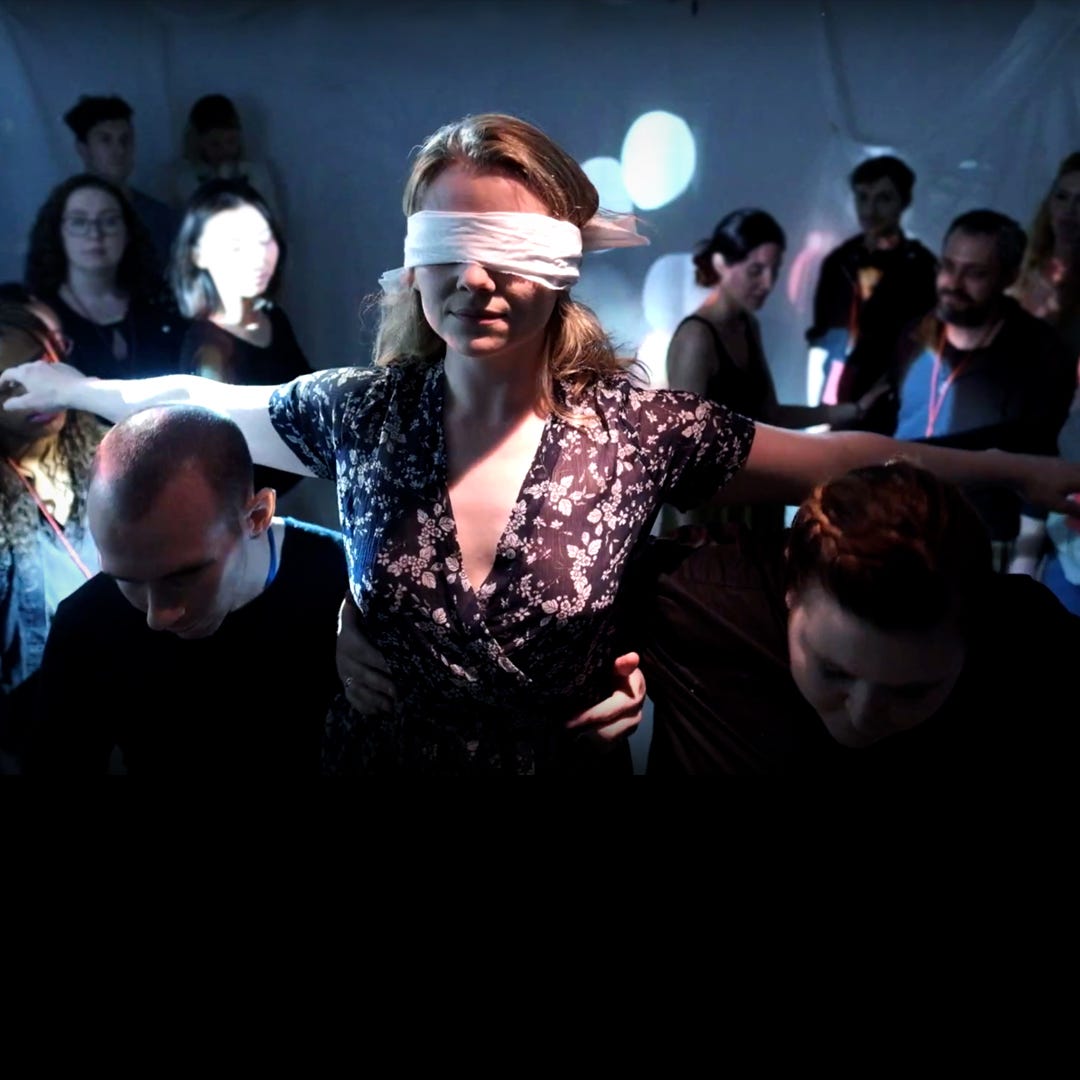 The living room is busy and crowded, with family photos spread all over the walls and on every possible surface. In the corner, there is a TV playing home videos of a small girl, one getting progressively older, and better at gymnastics, as the videos continue. The lights suddenly dim, and from behind me comes a quiet voice, singing. The source of the music appears: it’s a grown woman with a blindfold on.