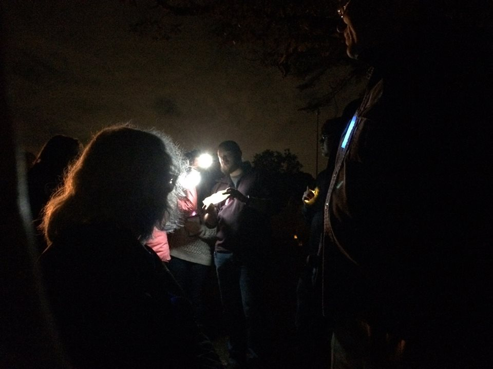 Daemonologie describes itself as a “game theatre experience, where the audience is responsible (or complicit) in the outcome of the story.” Based upon this concept, Daemonologie prepared attendees well for what to expect, with instructions to bring a flashlight and dress for the outdoors. I really wish more shows would do this: activate pre-existing knowledge, set expectations, and let people show up ready to play. They also succeeded at crowd control and staging despite the audience walking on paths in the dark. Colored glowsticks showed which of the four Puritan families each audience member was assigned to. And the performer to guest ratio was around 1:2.