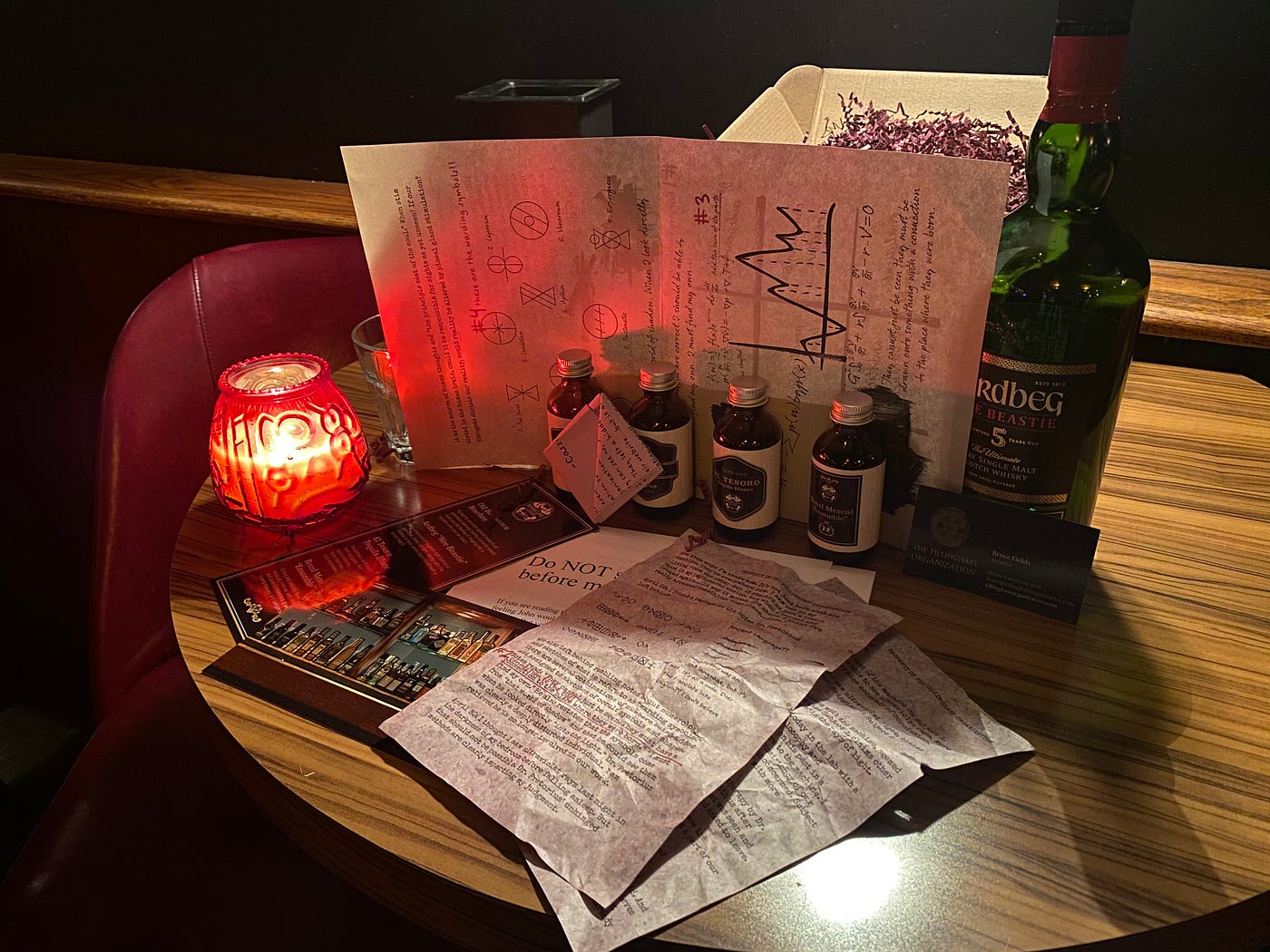 The base package, which rings up at $150, is intended as a meal for a couple. Up to two entrees are included in the package, or an entrée and an appetizer, along with four small bottles of spirits with two tasting pours in each one. That’s the food side of things. The puzzle experience features both physical and digital assets, but it also includes something anyone who reads NoPro is missing most: a live performance.