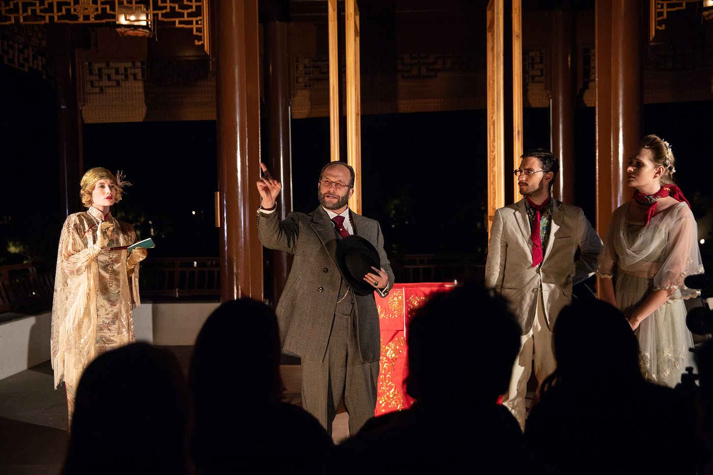 At the beginning of the play the audience is divided into two groups, with one group assigned to tour the garden clockwise and the other widdershins. Each group will see all the scenes in the play, but their path determines the order. Lai uses a palindrome structure — with each of the romances playing forward for one group, and backwards for the next. In my case I saw the California story “forwards” and the Chinese story in reverse. Both stories come together in a “show within a show” in the center of the play, and elements of one story echo and resolve themselves in their mirror images.