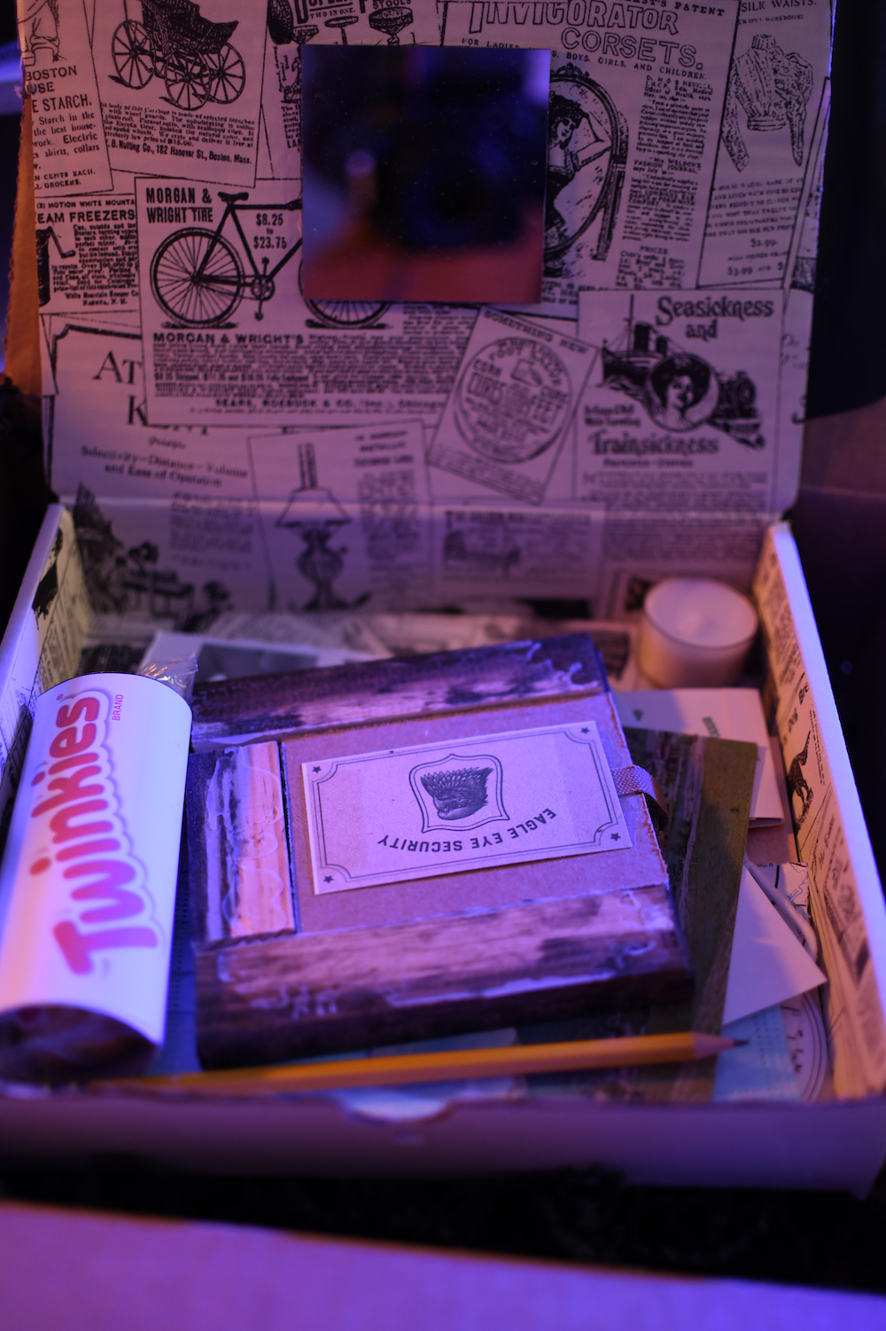 I would also be remiss in not mentioning the lovely package that’s sent out as part of the Lonely Hearts premium ticket experience with strict instructions not to open it until showtime. Within my box, I found not only an item personalized with my name, but a few other nice touches including but not limited to: a Twinkie from our courier friend Lara; a tea light and matches from Julia who sought solace inside her closet; pre-addressed and stamped postcard intended for Claudia; as well as a delightful picture of Mackenzie, Beatrix, and Giles (with a secret to be uncovered during the performance).