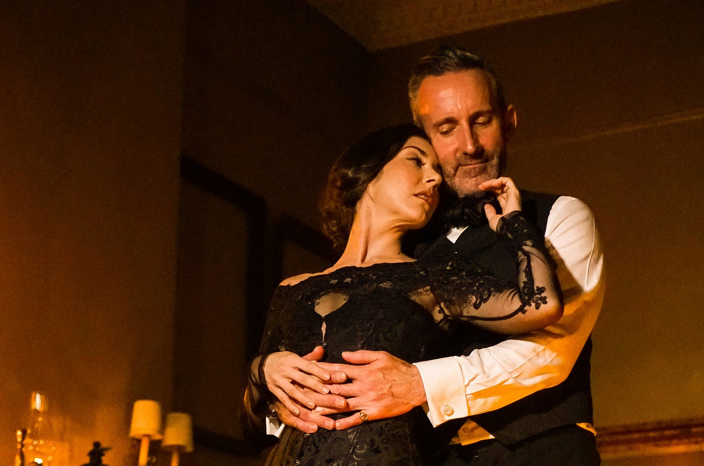 From there, The Bloody Deed of 1857 settles into what is essentially theatre in the round, something reminiscent of the recently closed production of Sweeney Todd nearby. As the medium attempts to make contact with the other side, we are plunged into darkness and hear rustling sounds all around us that eventually turn into the grunts and thuds of a bloody murder happening in the middle of the room. When the lights come back on, we find ourselves in a purgatory of sorts, with Emma and Harvey, as they try to ascertain where they are, when they are, and why the room appears to be locked from the outside.
