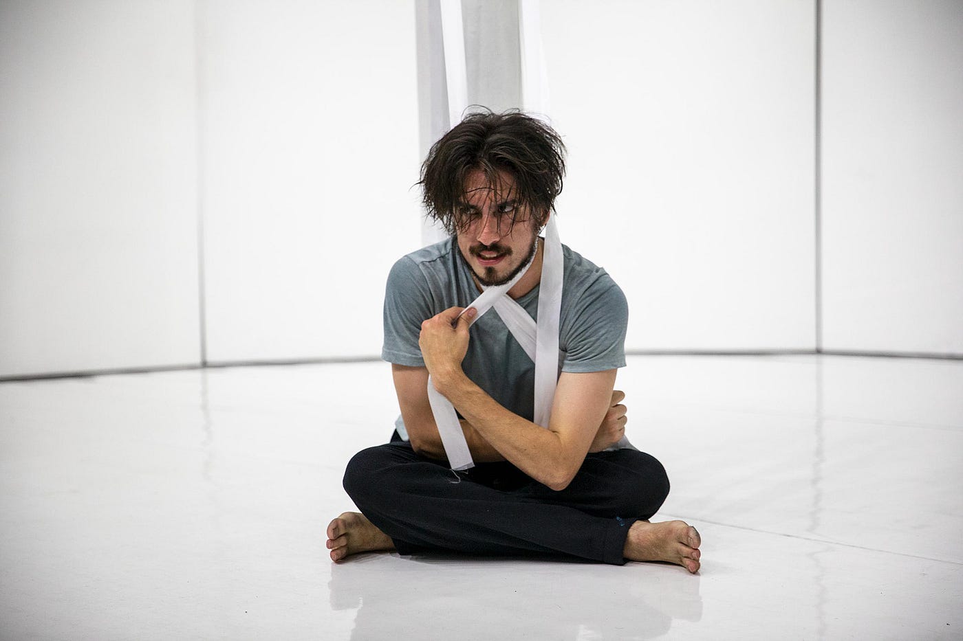 Each unfinished statement is spoken by the dancer (Jonathan Matthews) in front of us. The audience is enthralled, watching the single figure contemplating each phrase before moving. He dances frantically yet poetically, gracefully moving around a stark white room, dressed in a clean, crisp white outfit, like an artist trapped inside a mental institute. The dancer continues to verbalize phrase after phrase, never completing them, only extorting them into the space.
