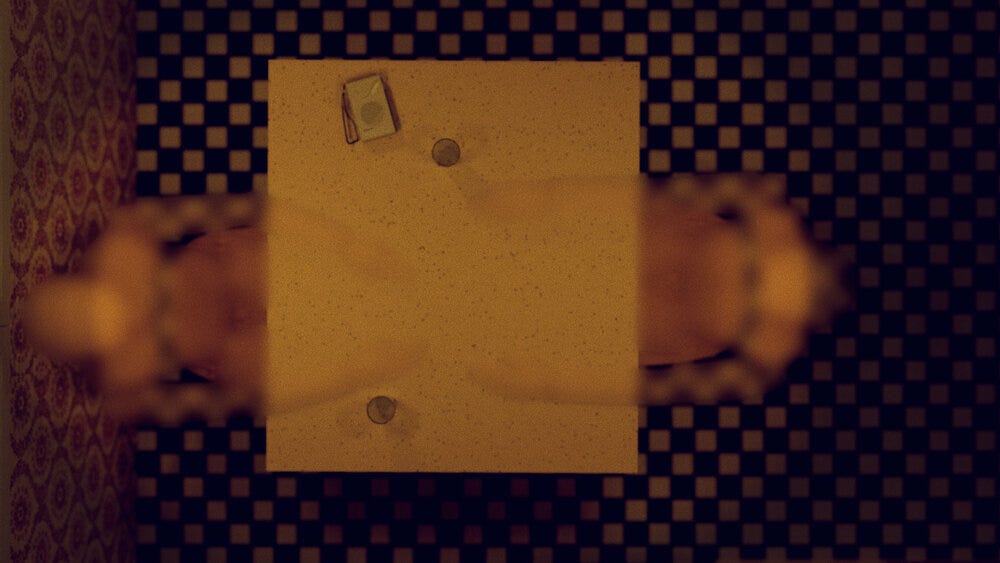 The commands continue. My partner and I each procure a glass of water and sit back down, placing the glasses in front of us and to our right, as directed. “This may be recorded for evidence or just to prove a point. Look at the face in front of you, this person who you met however long ago. You are both, of course, who you say you are.” Facing a face I’ve been in lockdown with, one I’ve looked at countless times, we obediently sip our waters and then close our eyes.