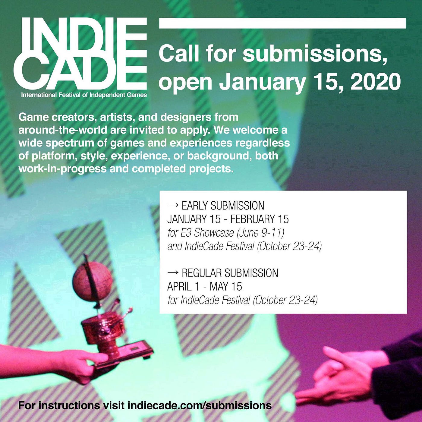 This year we have one application for opportunities to showcase at multiple events throughout 2020, including E3 in June and IndieCade Festival in October! We’ll also be adding additional opportunities in the coming months so stay tuned. Thank you! — IndieCade 🧡