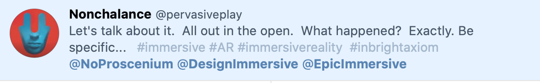 In addition to the No Proscenium web site, our podcast, and our newsletters, you can find NoPro on Twitter, Facebook, YouTube, Instagram, in the Facebook community Everything Immersive, and on our Slack forum.