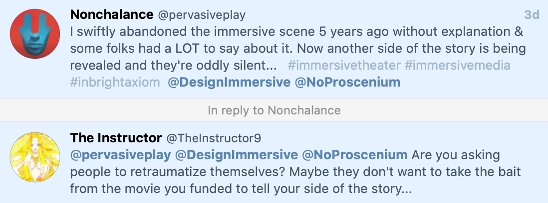 Findley goes into exhaustive detail on one particular exchange around the time of the festival circuit screenings of In Bright Axiom. As of this writing the Nonchalance account has yet to respond publicly to the thread.