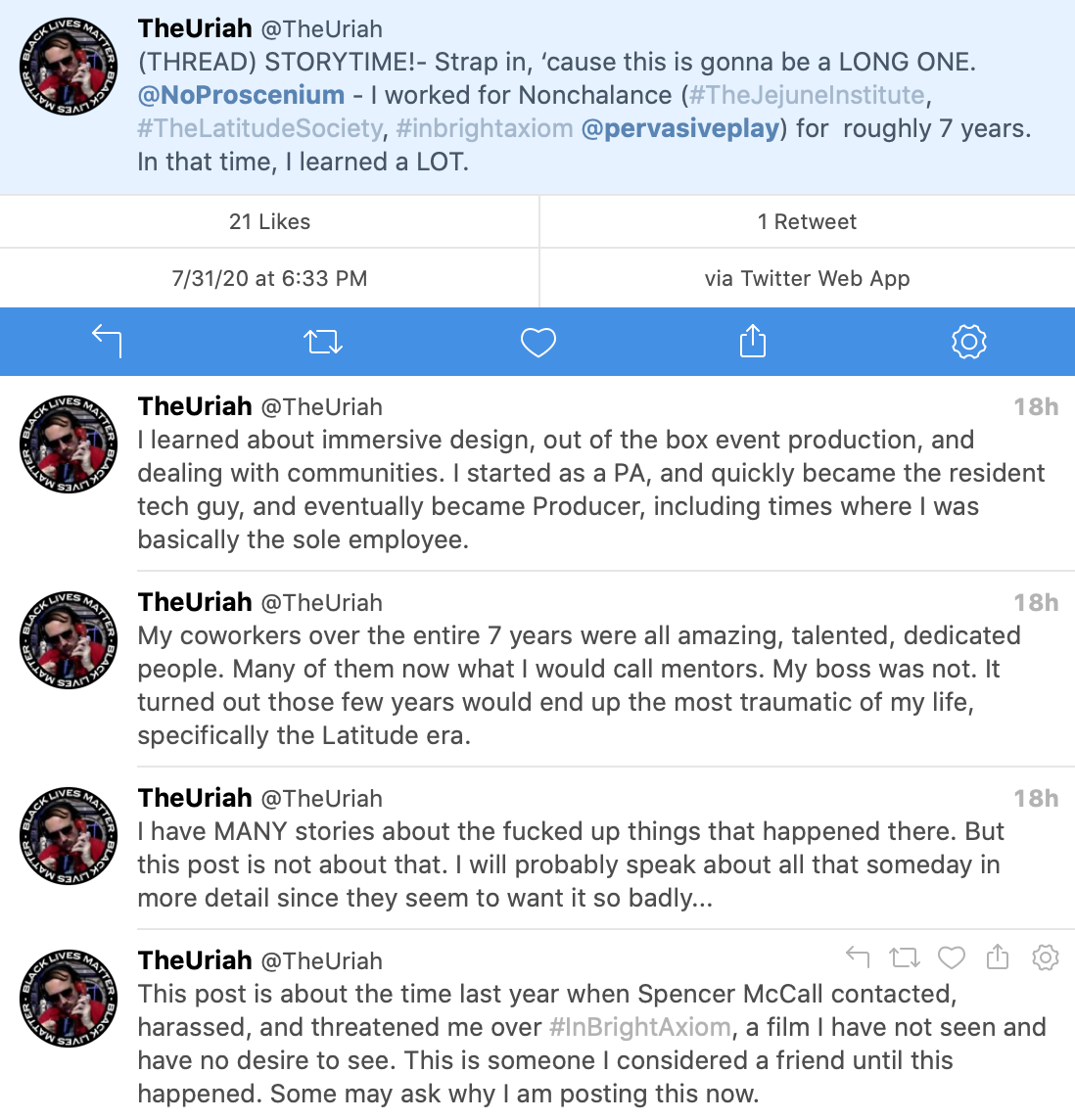 This call prompted a response from Findley, who released a lengthy thread about his interactions with the director of In Bright Axiom, Spencer McCall, and the head of Nonchalance, Jeff Hull, on Friday night.