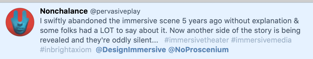Look, I’m a broken record at this point, but Sean Stewart’s essay Swings And Roundabouts: Theater Strikes Back, is a must read about the role of the audience in the theatre of now. Not just immersive theatre, but theatre in general. Expect more on this anon.