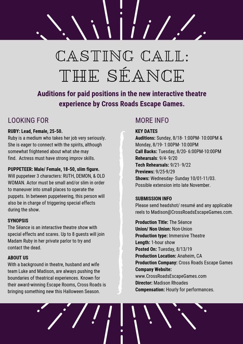 Now casting for their newest interactive theatre experience, The Séance! Looking for a female lead and puppeteer. Double cast. Hourly compensation. Headshots, reels, and resume can be sent to Madison@CrossRoadsEscapeGames.com