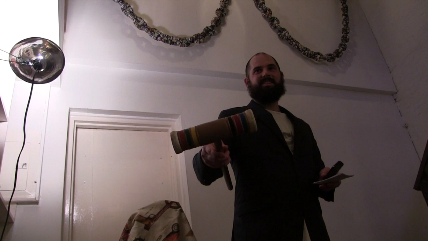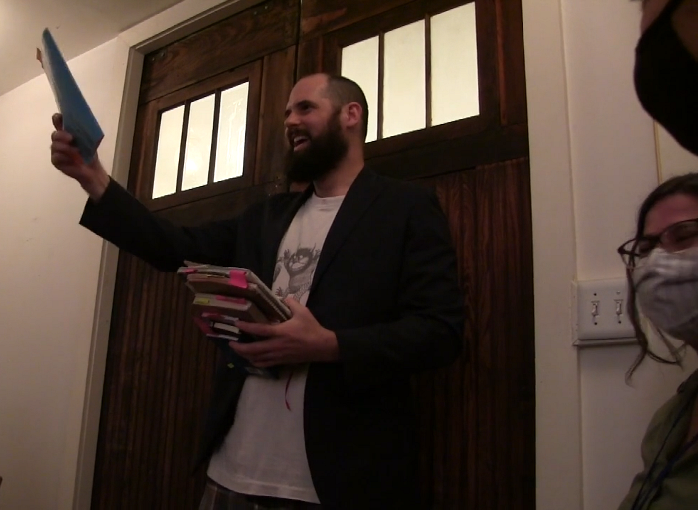 The show isn’t all sullen, though. We collectively all pick through Jeff’s journals, notebooks he’s kept from well before his college years up through present day. Here is a journal filled with Biology notes and a Thai work permit. Here’s some rambling freshman poetry from a journal kept to record random thoughts while high; it describes Batman retaining hope after a career-ending disability. Evans probes each passage for some semblance of meaning, declaiming them as if his adolescent ramblings are pearls of wisdom. Between monologues, he finds humor in the odd little rituals that kept us sane; he keeps coming back to the same songs over and over to play in the background as we rifle through the journals, and will declare a break for us all to fuss with and find distraction in an ancient Bop-It. The whole exercise finds humor in the struggle to hold onto one’s identity as the world comes crashing down.