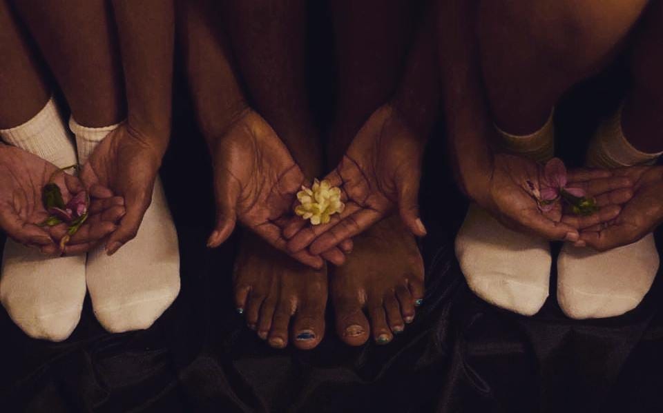 At the end of the show, the house lights come up and we, the audience, don’t know what to do. We sit in stunned silence, unsure if applause is the right move. Or is there is even a correct response at all. A woman in the audience gets up. She’s brought flowers tonight. She places a single pink flower on the floor, next to the white wooden box in remembrance.