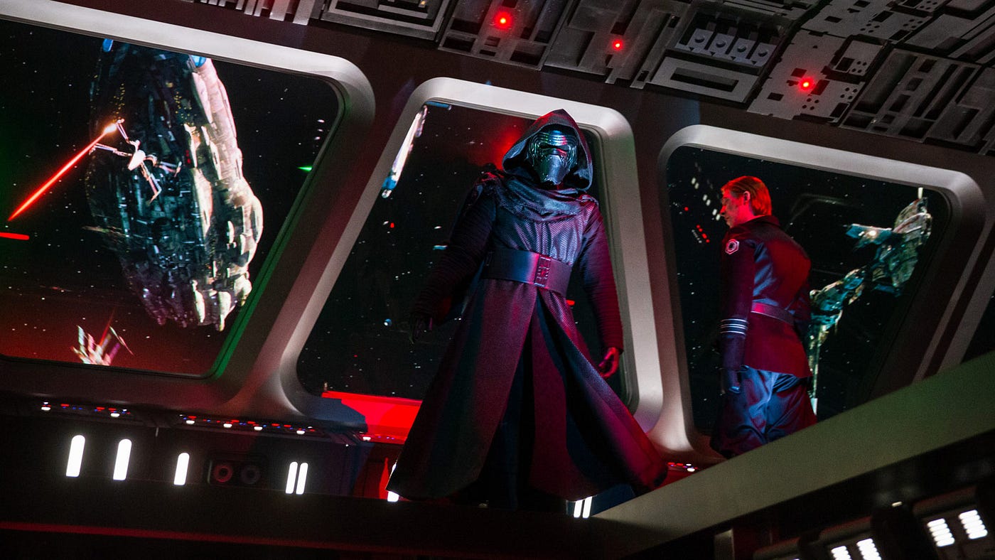 The buzz around Rise of the Resistance and the elusiveness of getting a spot in its virtual queue means you’ve probably seen at least one of the ride’s Insta-ready epic reveals on social media: a Star Destroyer’s hangar bay, in which an entire company of Stormtroopers is set in front of an enormous window looking out into deep space. We gaze, slack-jawed at their intimidating formation as TIE fighters whoosh by and another Star Destroyer lingers in the distance. The neon glow of the window’s edge is reflected in the shiny, black floors while stern First Order officers, clad in all black, stare back at you, at the audience.