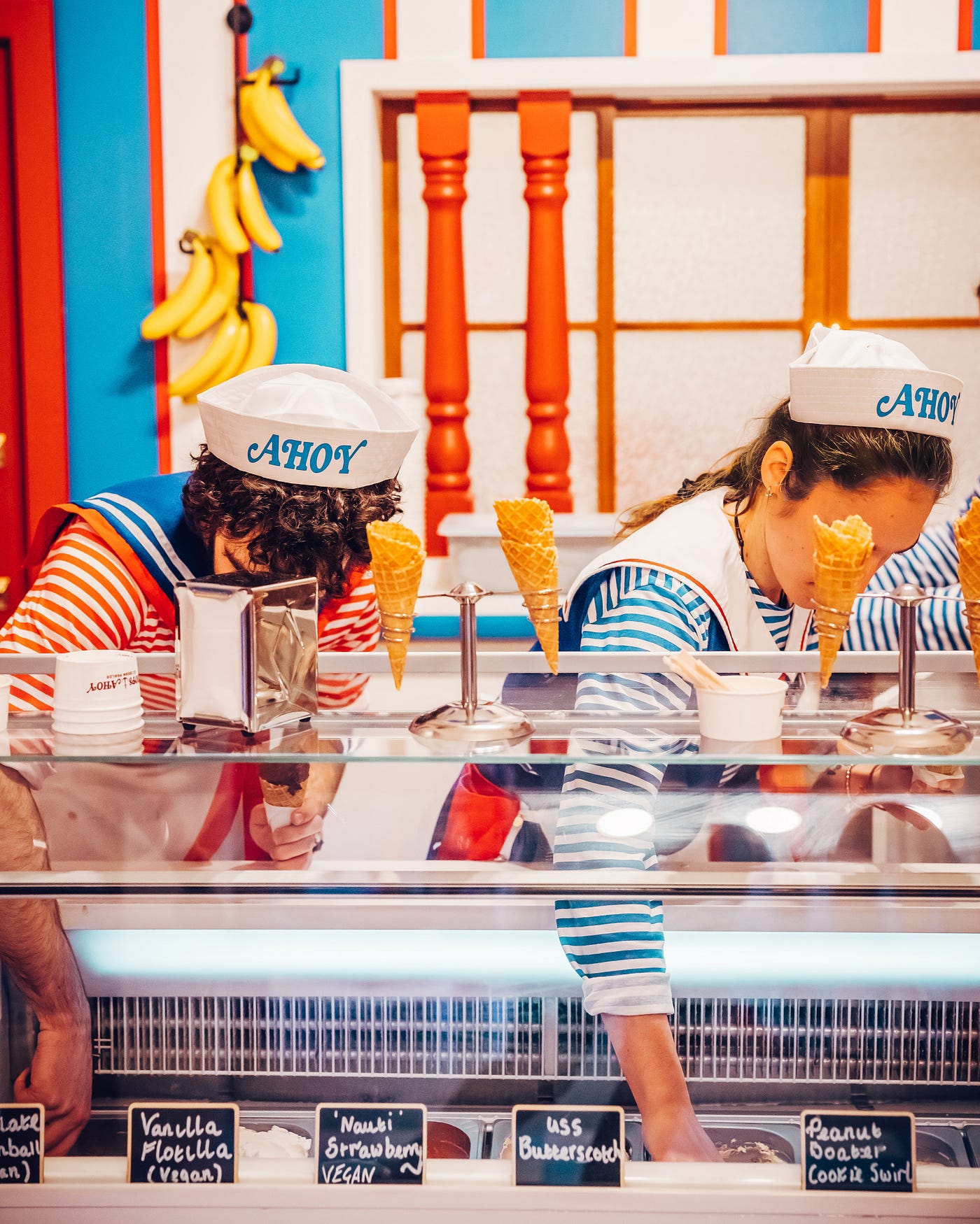 The size and scale of the “Hawkins Reunion” is overwhelming. Once we’ve made our way through the check-in, we find ourselves in the middle of the brand new Starcourt Mall. To the left is the Hawkins News Network media station, where live broadcasts are being made. Disinterested and snarky employees await new customers in Coach. A videobar, like something I had only ever seen before in Back to the Future II, is serving a wide range of drinks. A MAC makeup stylist is greeting customers, and offering the latest in 80’s style makeup trials, while Fashion Forward has all the latest trends for people to try. The Video Game palace has half a dozen arcade games while a lady in neon aerobics gear is encouraging people to get fit in her live dance exercise class. Meanwhile, folks like me scoot past all this to get to Scoops Ahoy, the nautically themed ice cream parlor from the show.