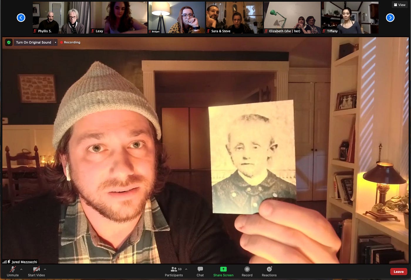 It is, however, required to keep your video on during the show, so we all can hold space symbolically. The part where Jared shares the results of his investigation in the beginning of the show happens in gallery mode. There is something haunting in the way the Zoom grid is continued by the row of black and white photographs of the dead people on my desk. One particular woman is staring at me intensely (the cause of death unknown). So is the 13-year-old boy who died after being stung by multiple bees.