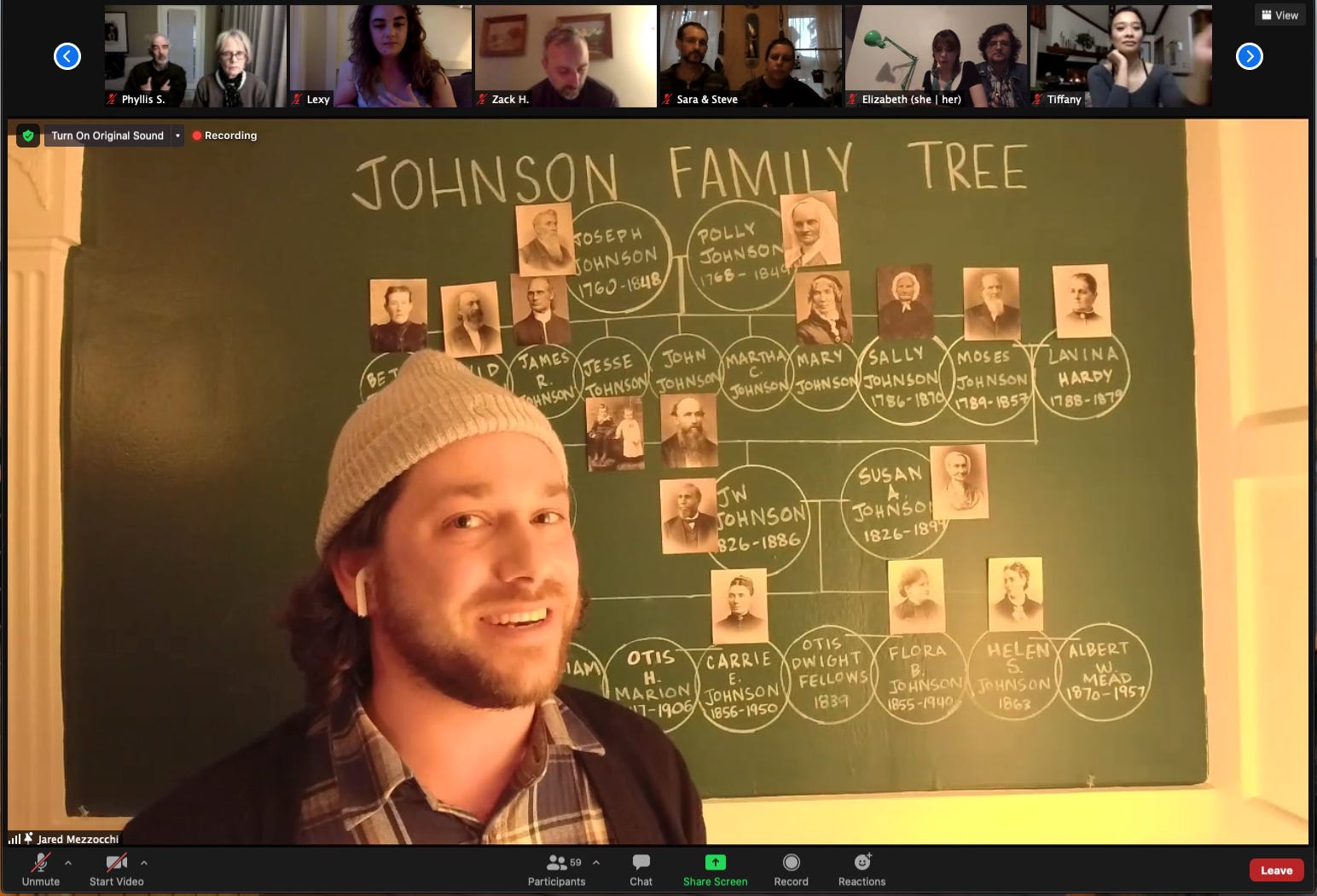 Jared has conducted impressive research, recreating the family tree of the Johnsons, which he proudly presented to us, complete with the old black and white photographs of its members. Each of our boxes contains a copy of the family tree so we can follow along with the story. Indeed, it would be difficult to do so without the visual reference — matriarch and patriarch Polly and Joseph had nine children alone!