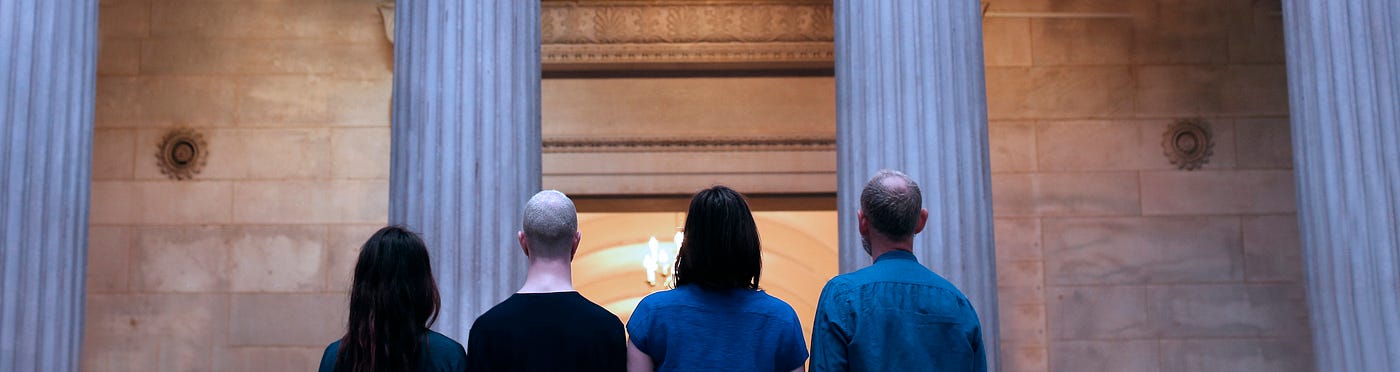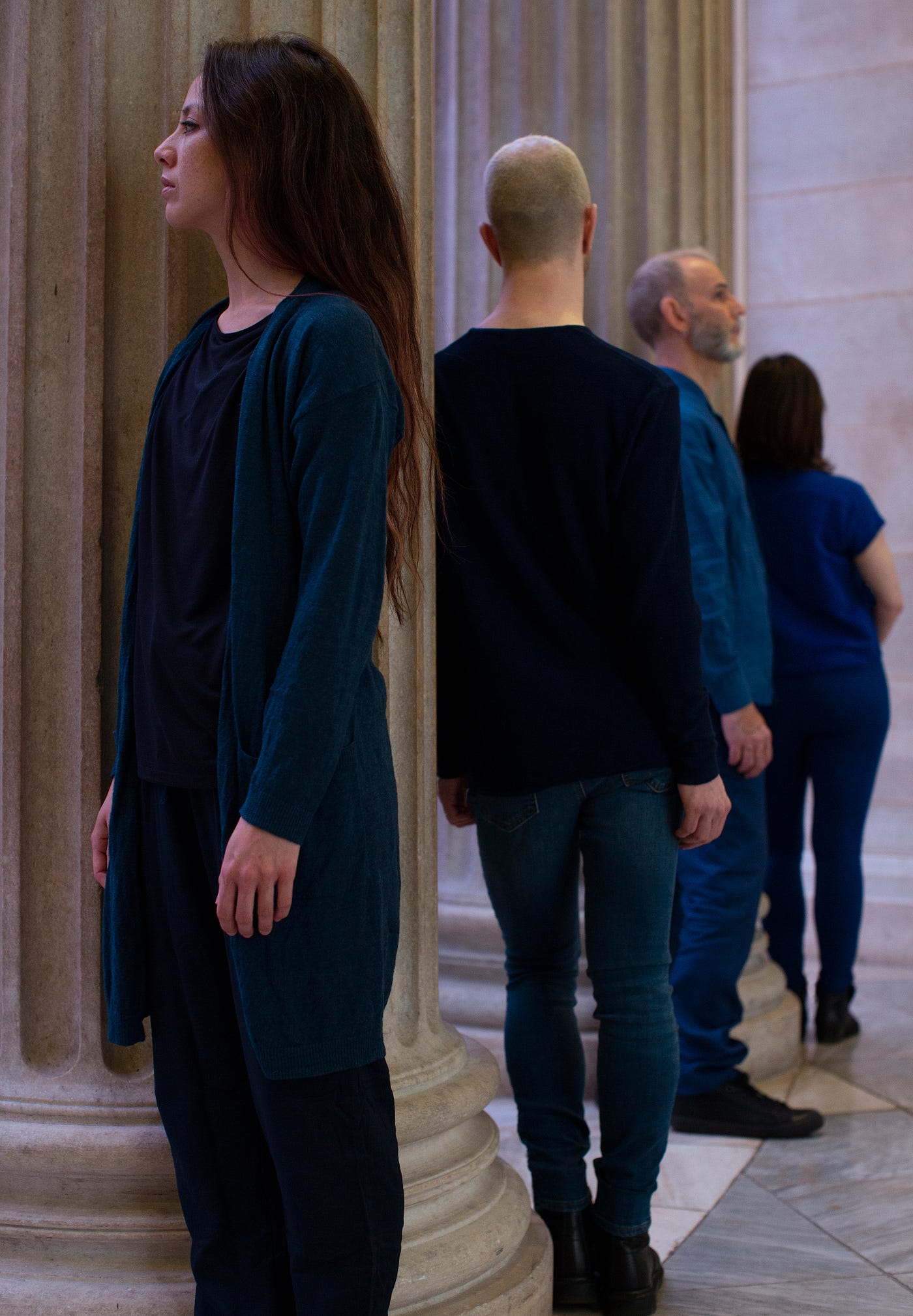 If you come to see The Listening School, all you will see are people dressed in blue co-inhabiting parks, plazas, courts and atriums. They seek to speak with New Yorkers about their experiences, thoughts, and opinions on listening. And they will ask New Yorkers to choreograph them: “Where should we listen? To what should we listen? To who should we listen?” So, there is nothing to see but much to experience. And during The Listeners performance at Federal Hall National Memorial, the only way “to see the piece” is to enter the hall, one at a time, and sit to speak privately with a listener. Because credible, true listening requires a set of conditions that are unspectacular.
