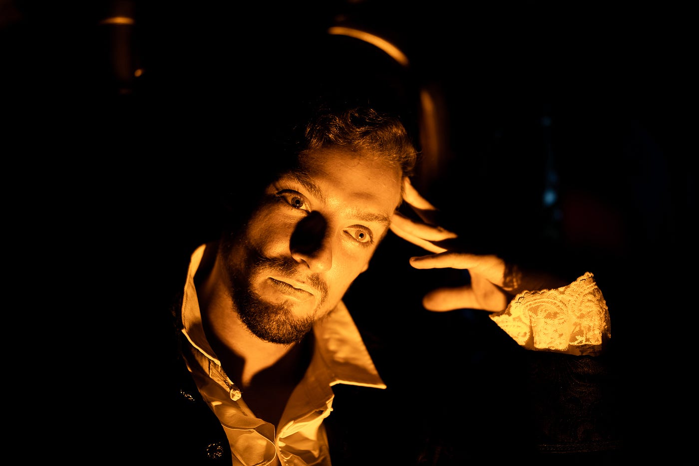 Noah: For our second scene, we were brought back around with blindfolds into a dining area with actor James Cowan at the head of the table. Another veteran performer — Halogen really did get a murderer’s row for this — the scene brought two groups together for a feast. A feast that turned into a game of riddles.