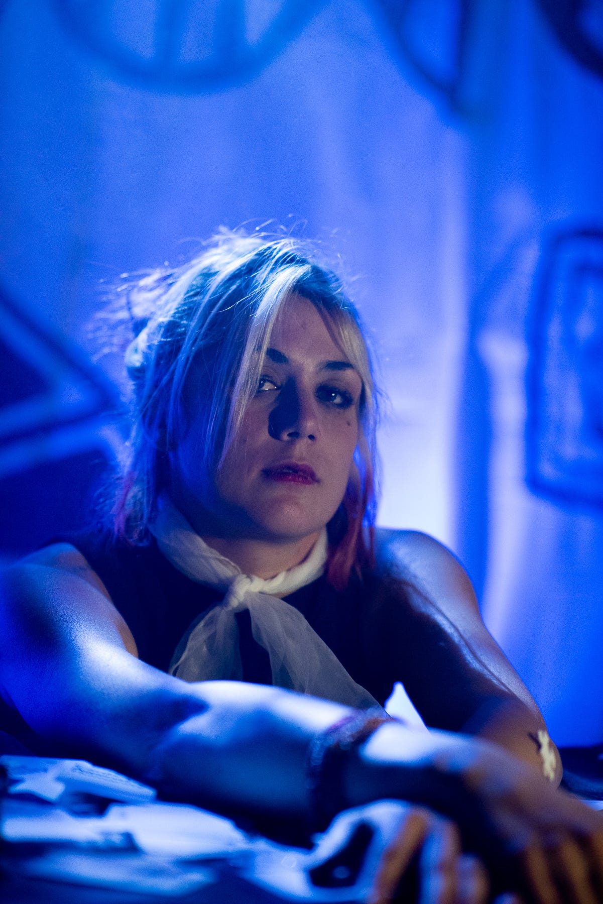 Anyways, my first scene had a kind of similar thing going on. The design elements elevate it: I’m a sucker for an eye patch and a light that someone moves around to interrogate people with, and this sequence had both. I was actually unfamiliar with the actress in this scene, but she digs into the part going both big and small when it was called for (the “small” works, but runs into some heavy sound bleed issues with everything else going on, which kiiiiind of works with the setting, but also doesn’t). There’s a little twist to the sin, the script walks you in one direction, before revealing where you were actually headed. It does go heavy with the monologue though, and again, it’s some good writing, but the scene is at its strongest when Skye and the other actress are sniping at each other.