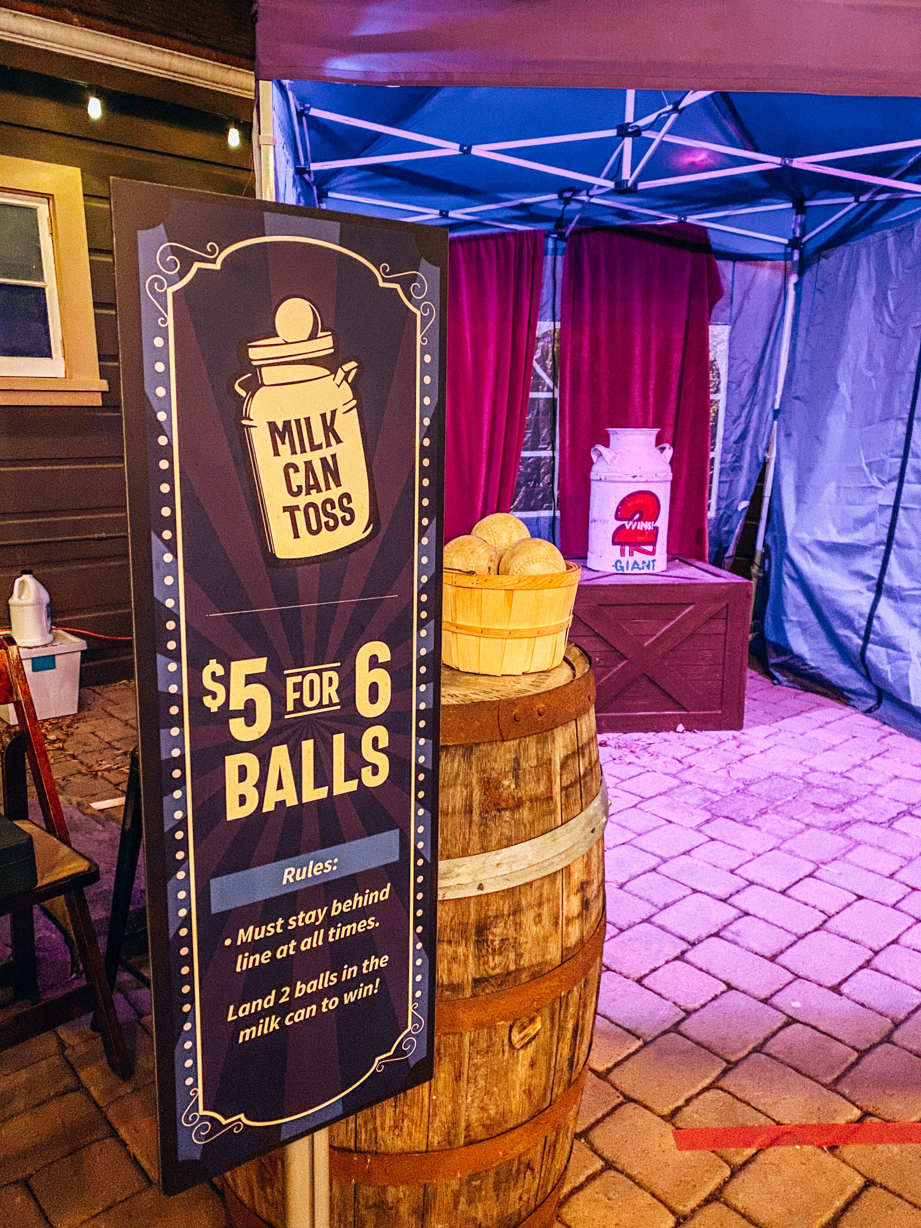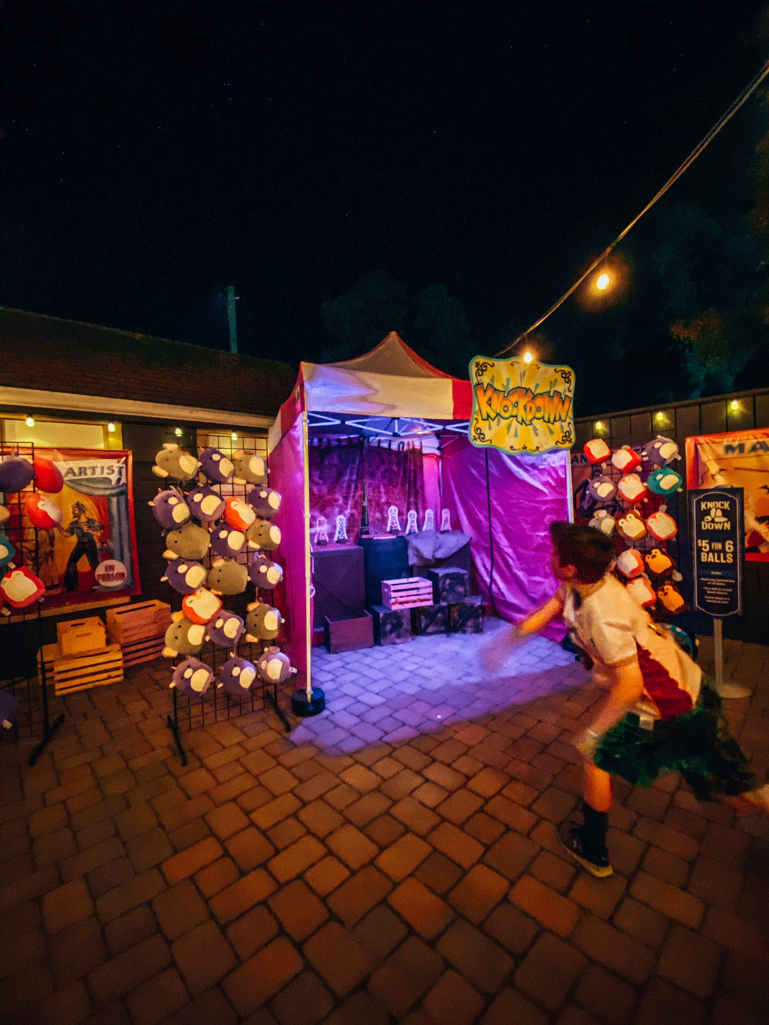 The courtyard/garden area is transformed into a carnival with games and prizes, and a modest bar is set up in the center, offering cocktails, beer, and wine.