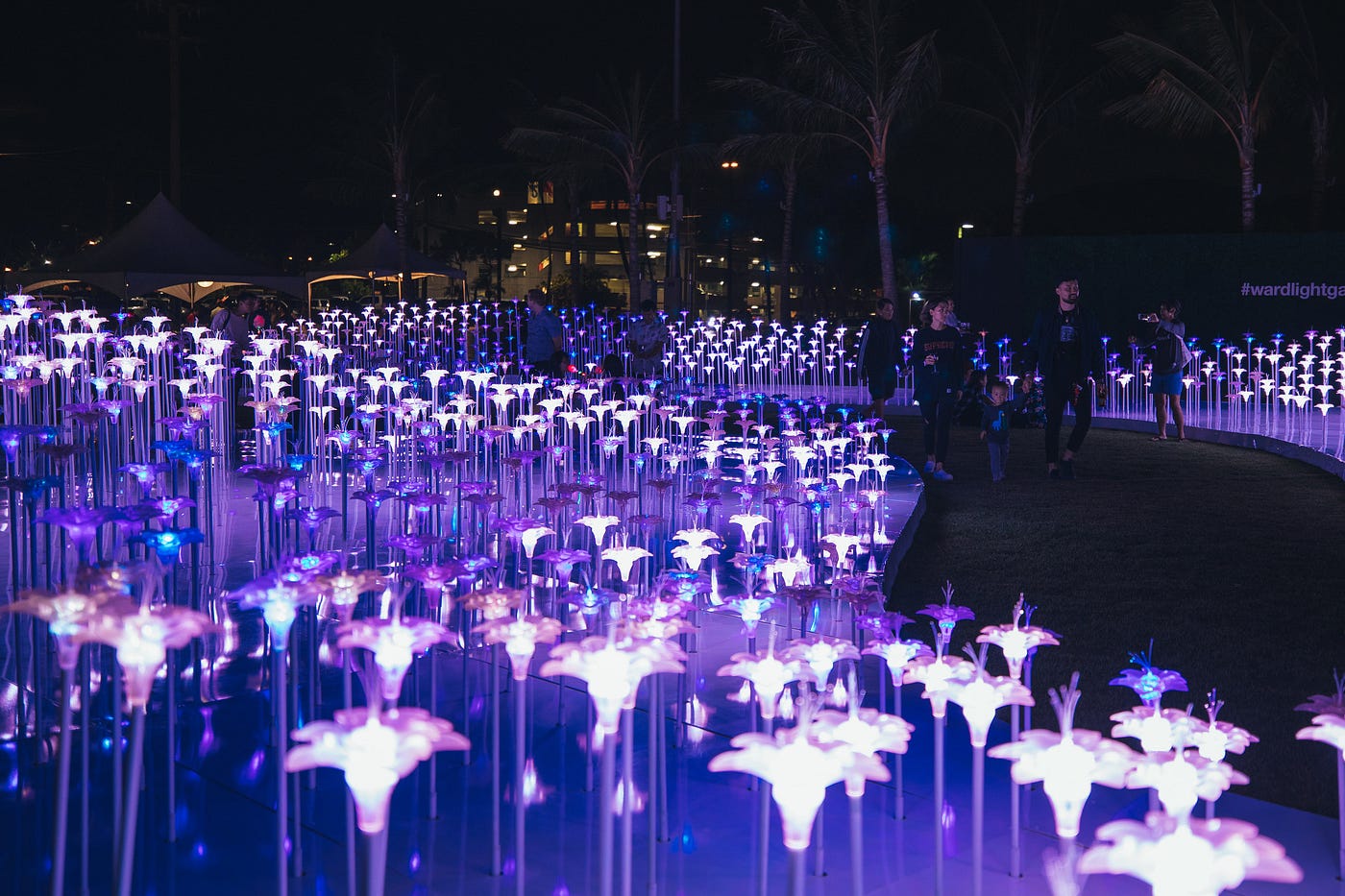 The Light Garden is a dazzling, cutting-edge installation in the new Victoria Ward Park. Designed by Symmetry Labs, this field of luminous flowers changes colors as it reacts to music, sound and movement. Inspired by the Hawaiian flora, Light Garden, a 1,000-Year Bloom features over 25,000 LED lights in more than 2,300 floral 3D sculptures spanning 9,500 square feet, and is Symmetry Labs’ largest-scale work to date.